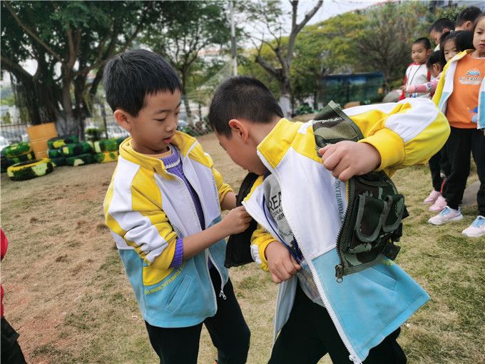 穿好衣服,戴上钢盔,一切准备就绪,小队长带着自己的小兵出发拉练啦。