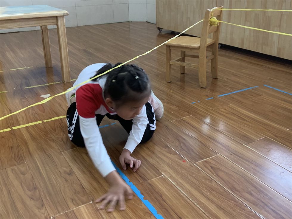 看,平时萌娃们坐的小椅子加入了细绳这个辅助材料,居然也可以变成了一个小小的运动关卡。通过钻、跨等动作,体验蹬、伸腿的动作要领,锻炼萌娃们的协调能力。