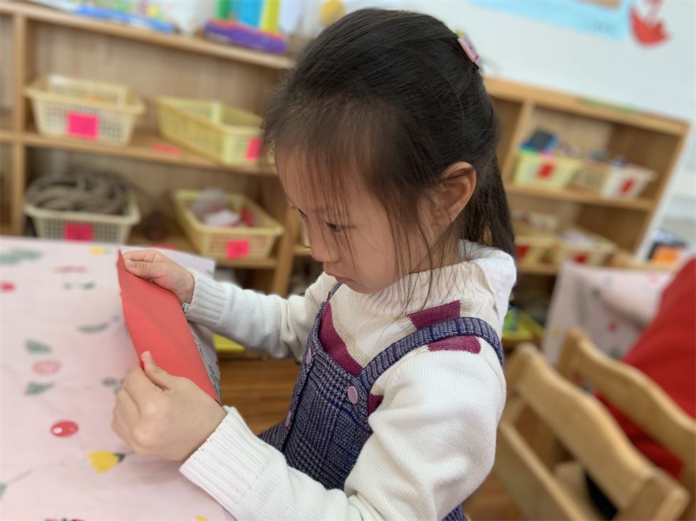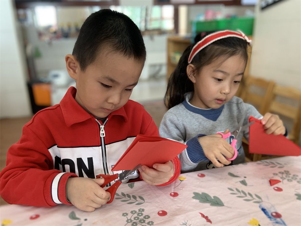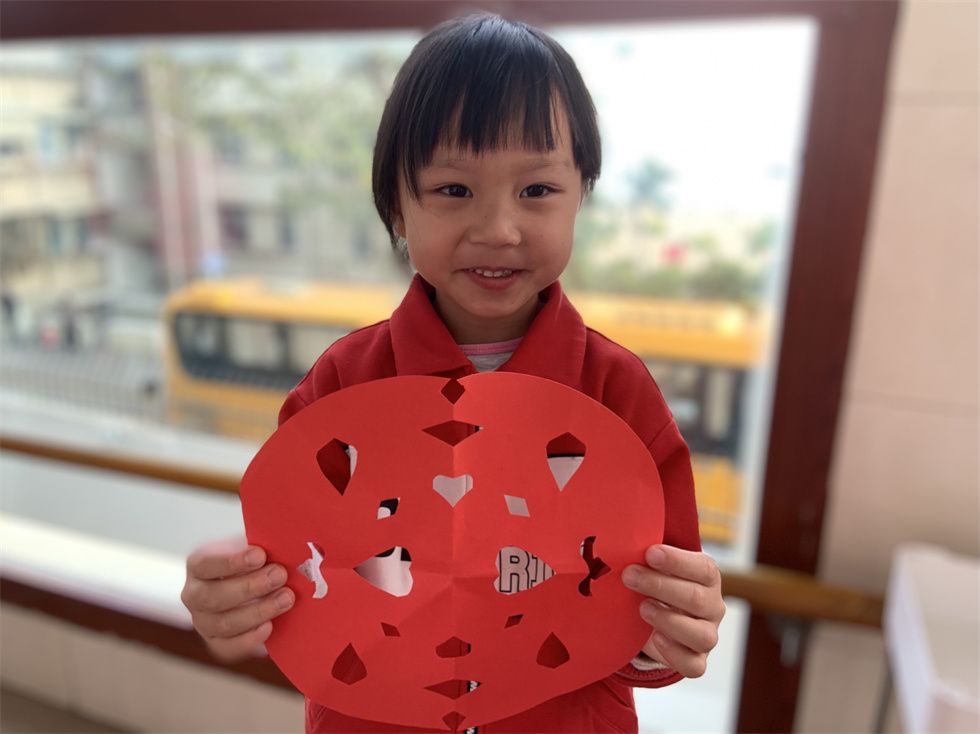随着一声声“咔嚓咔嚓”的剪纸声,一张张红色的彩纸在宝贝们的手中快速地转动着,不一会儿一幅幅作品就完成啦。