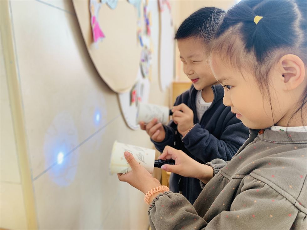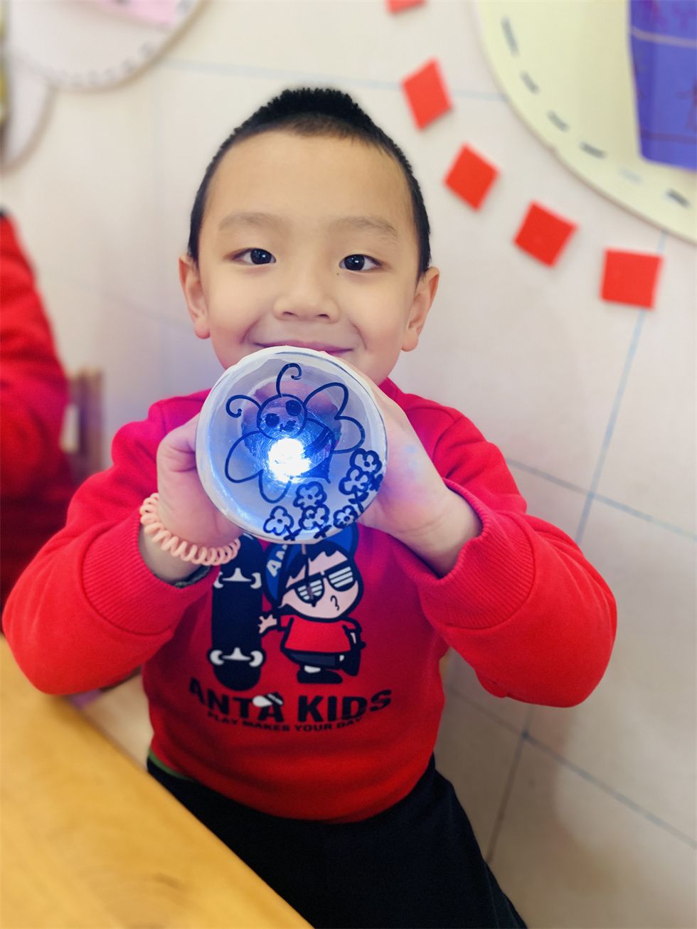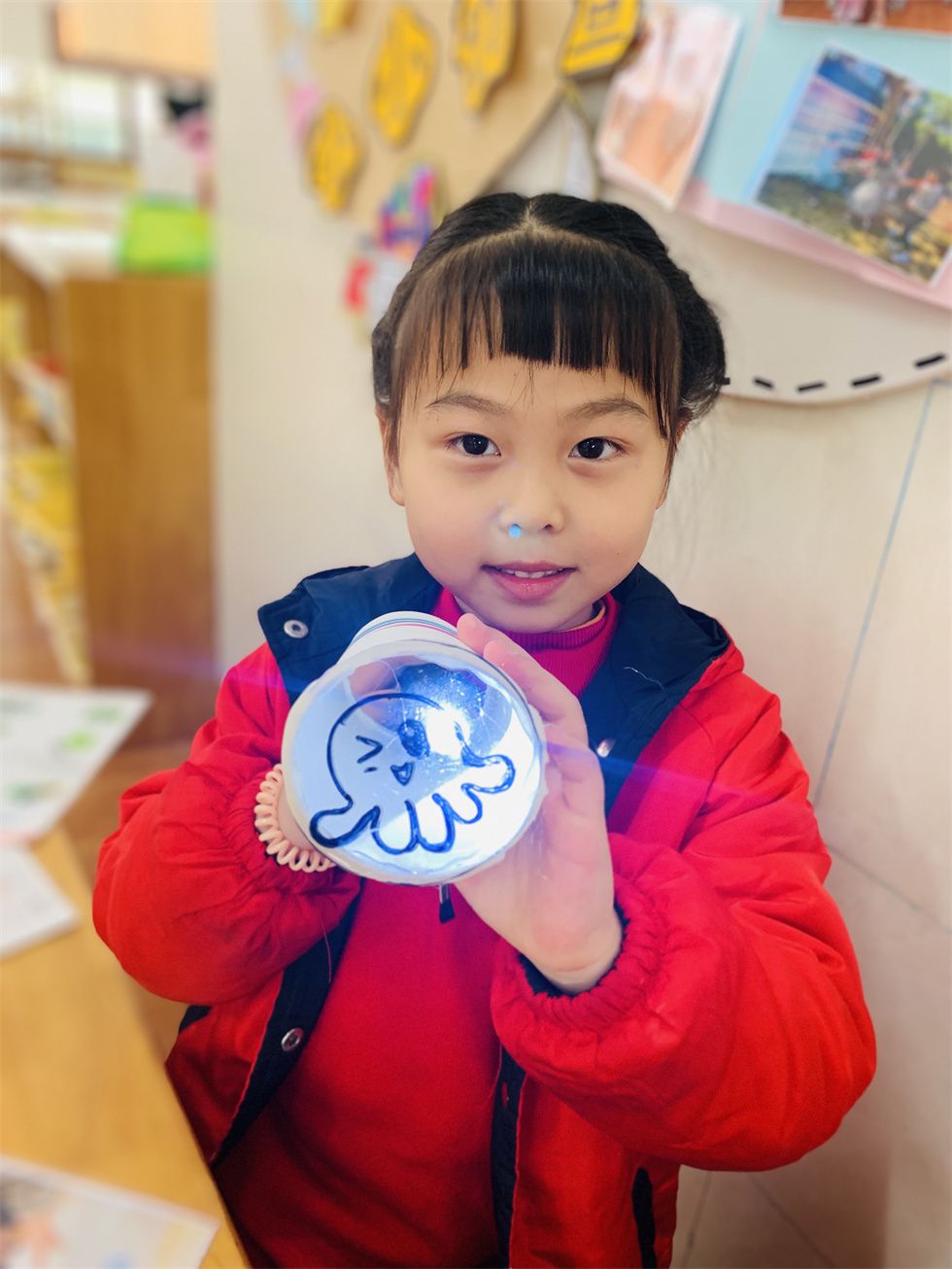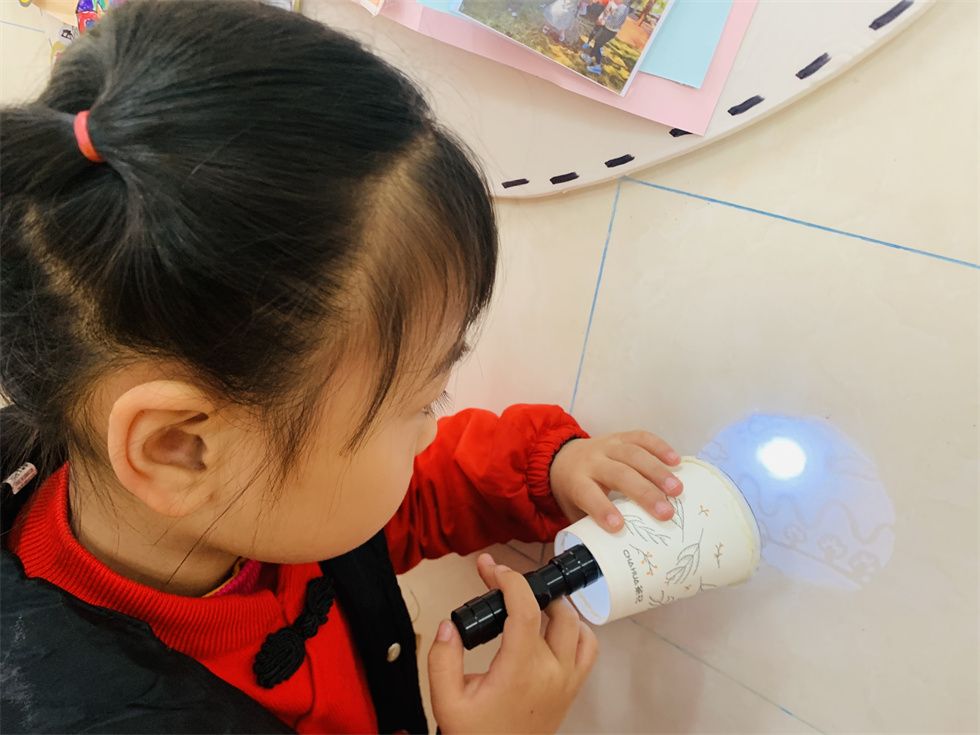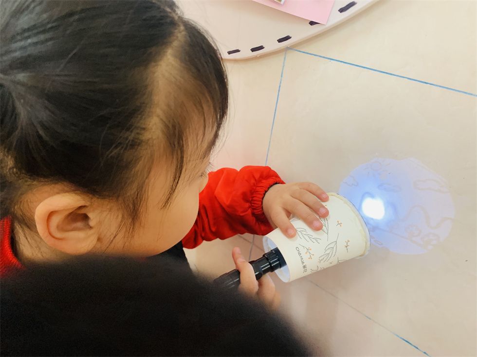 大班科学知识“光和影子”玩具,也吸引了孩子们每天探索:纸杯上盖着透明的塑胶片上绘画了各种动物、植物等图案,通过手电筒远、近不同距离的照射,探索把图案投射到白色的墙面。