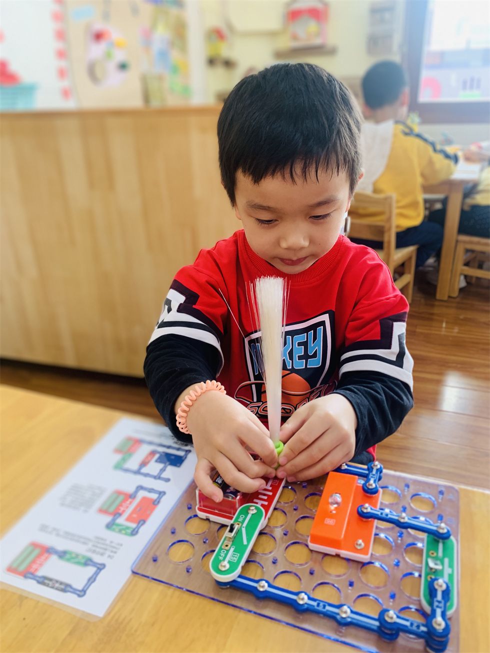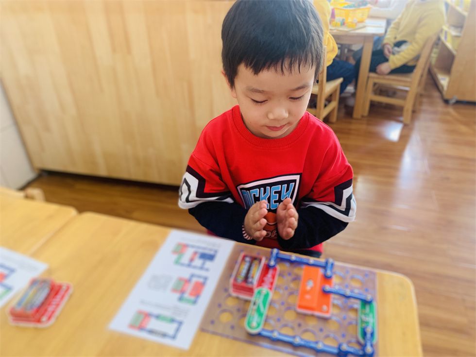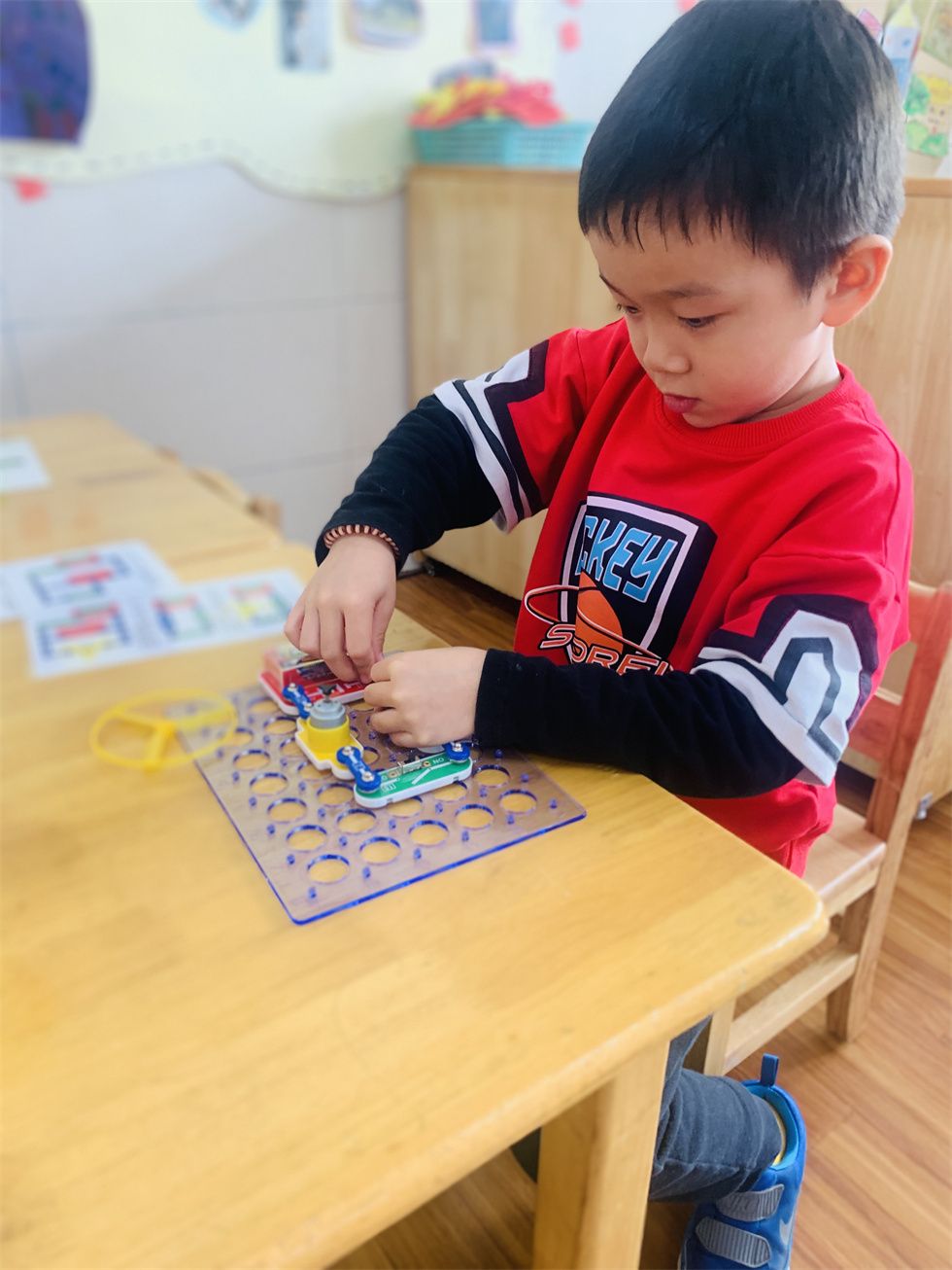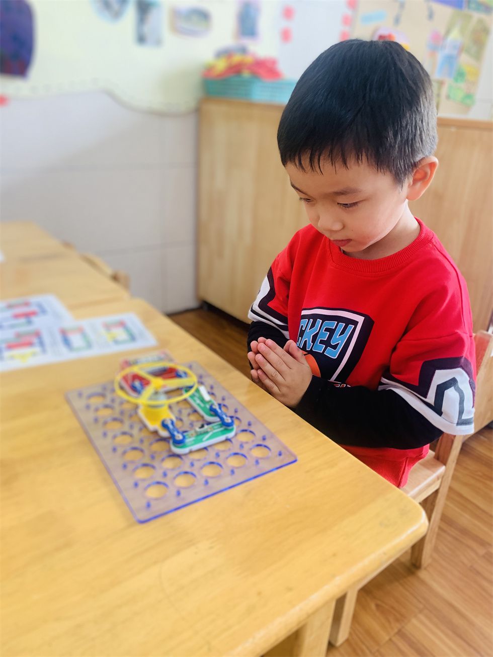科学区的“电子积木”是新投放的科学材料,看,万泰小朋友每天都要来探索一下新的电路连接方法,他自己尝试着看电路图、按照电路图学习卡的指示,拼接出了“警报声”、“电风扇”.....成功后的喜悦溢于言表。