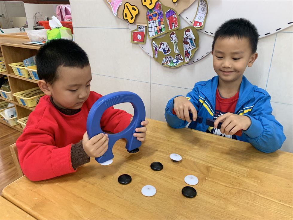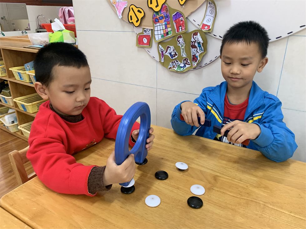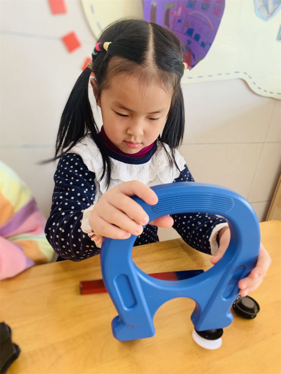 “有趣的磁铁”也是符合大班年龄段的孩子们操作的玩具,小朋友们通过自己的操作、摆弄,发现并揭示磁铁的“同性相斥、异性相吸”的特性,建立有关磁性原理的粗浅概念。