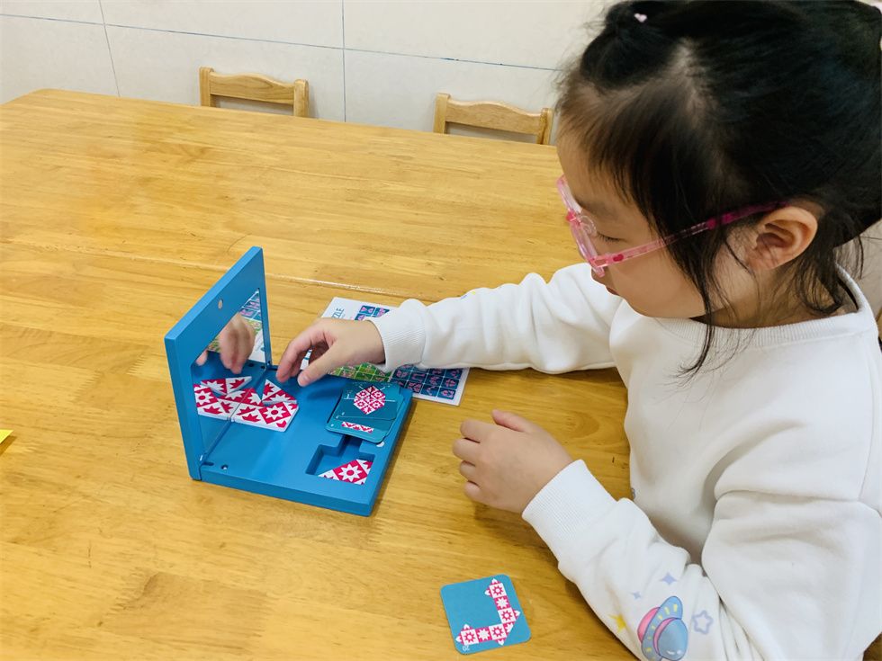 “镜面折射”的科学玩具,也是每天吸引爱动脑筋的小朋友前来,通过各种的摆弄,了解平面镜的特性:第一次操作,发现辅助物数量的变化;第二次操作,把镜子面对面进行探索......从而让小朋友体验到“科学就在身边”。
