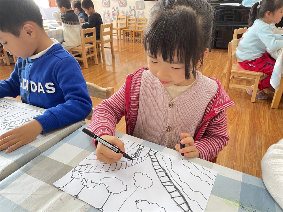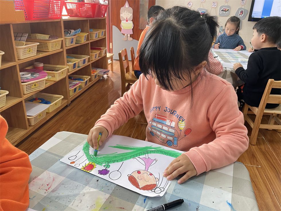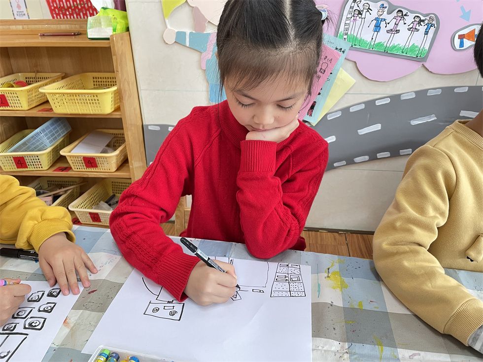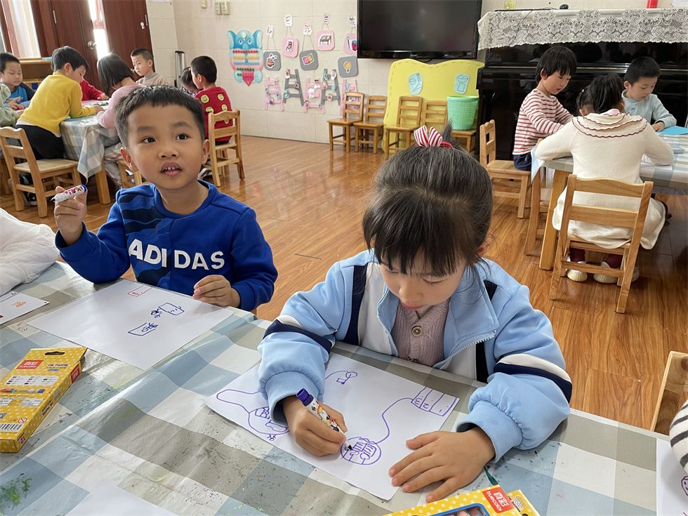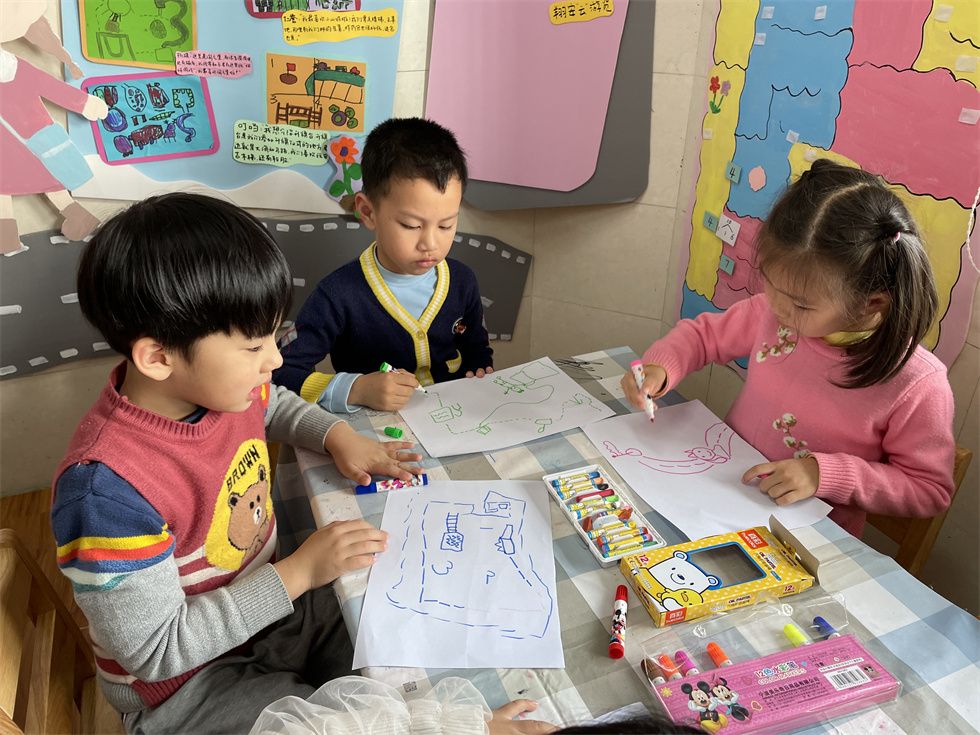 熟悉了每间教室的功能和排列,我们立刻动手把他们画了出来。淘气堡的秋千、科学发现室的机器人、美劳室许多美术工具和作品……
