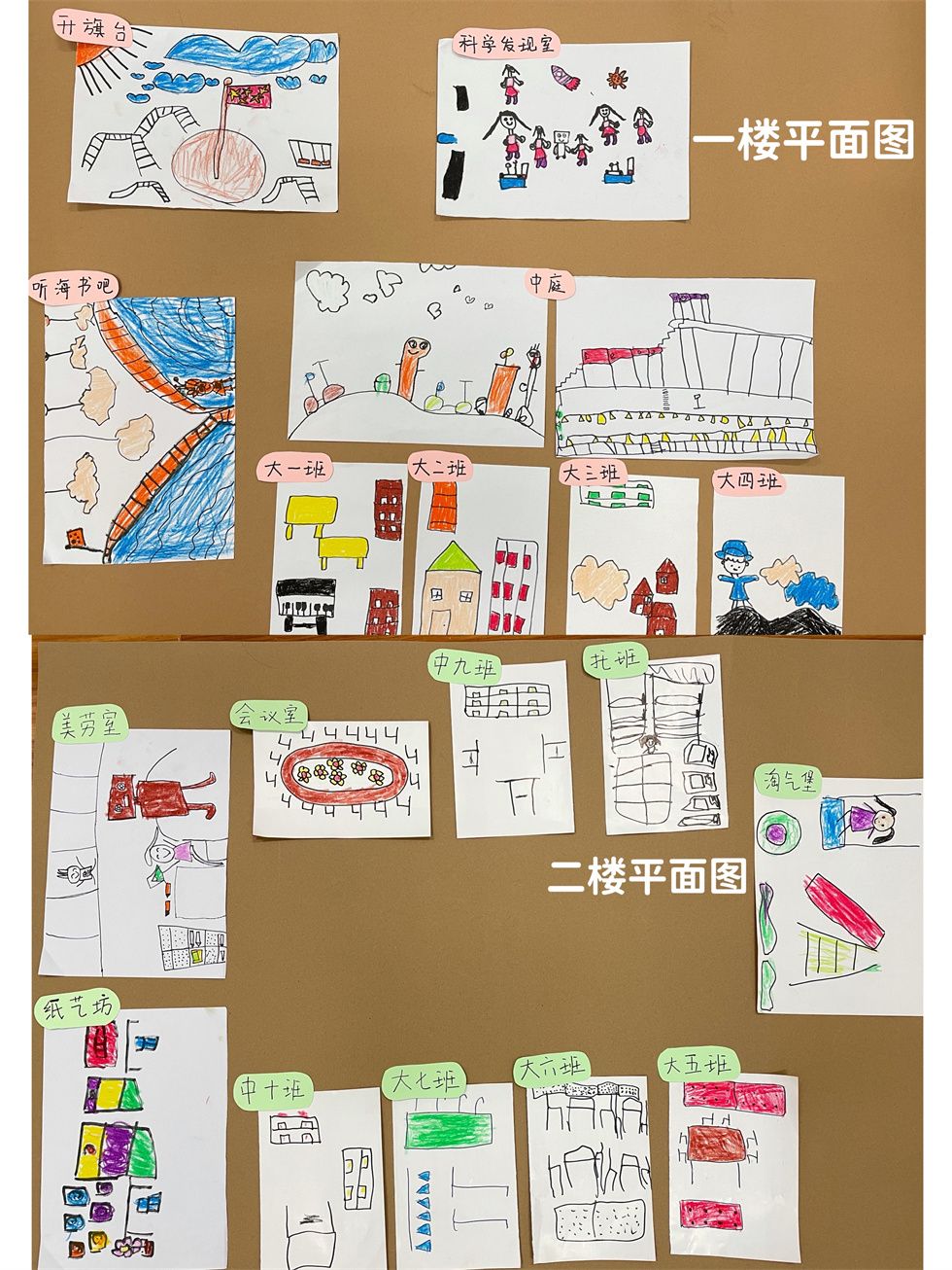 你们知道幼儿园里都有些什么地方吗?地图该怎么绘制呢?老师找来了学校的平面图,我们根据平面图上面的教室分布情况进行了排列。