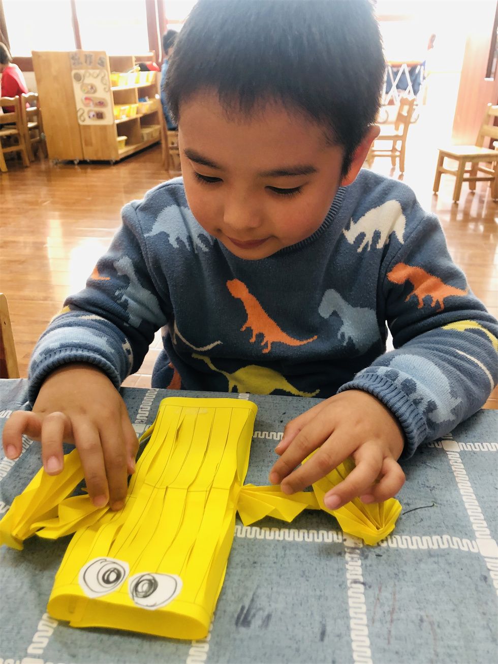 洋洋认真地摆弄着她的鱼灯笼尾巴,左摆摆右摆摆,好像都看起来不太合适,最后他平平的平放在桌子上,可爱的鱼灯笼尾巴好了。