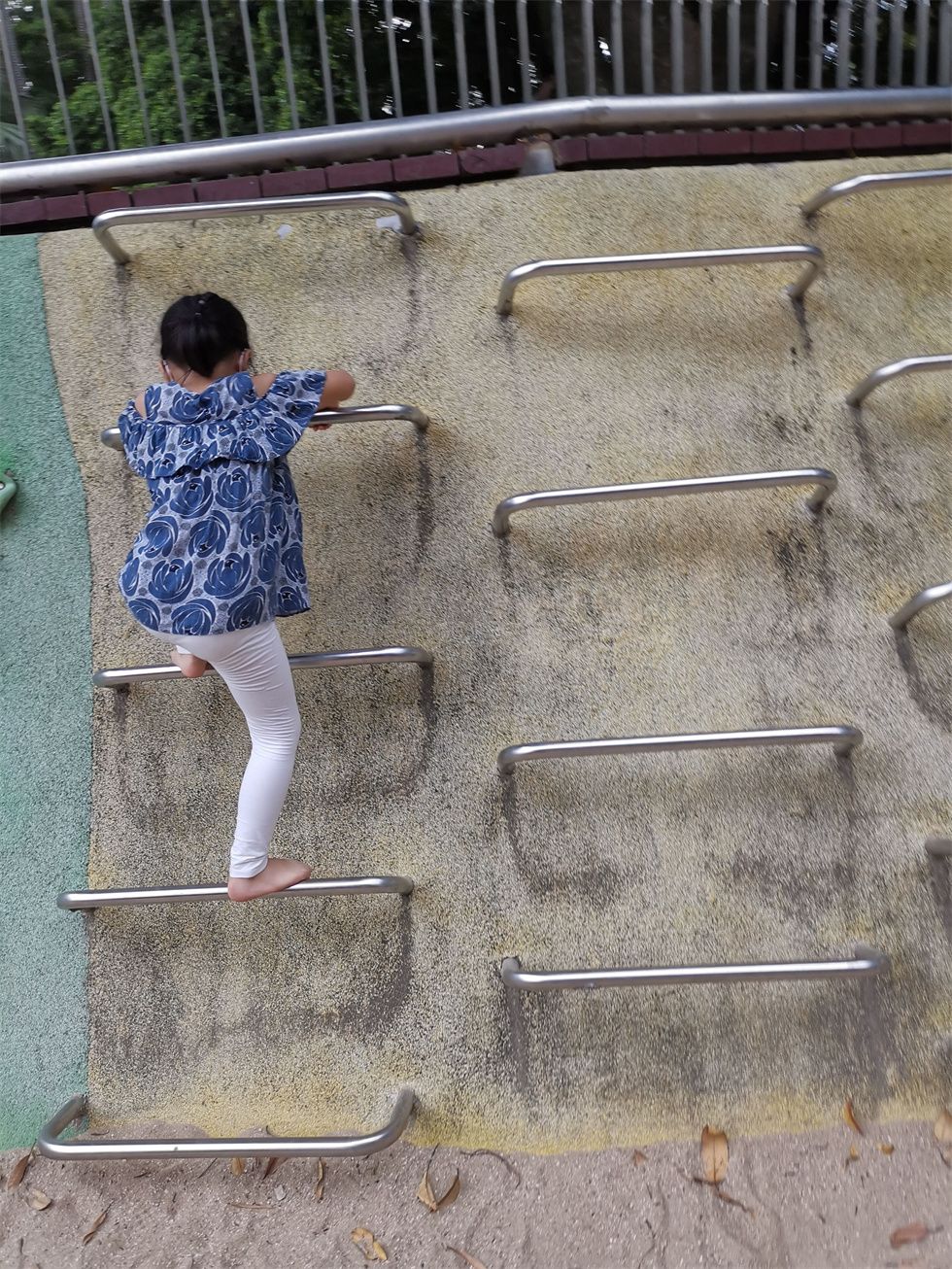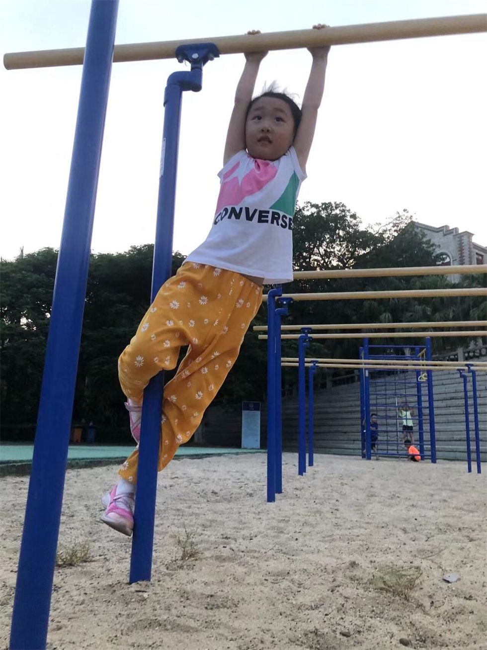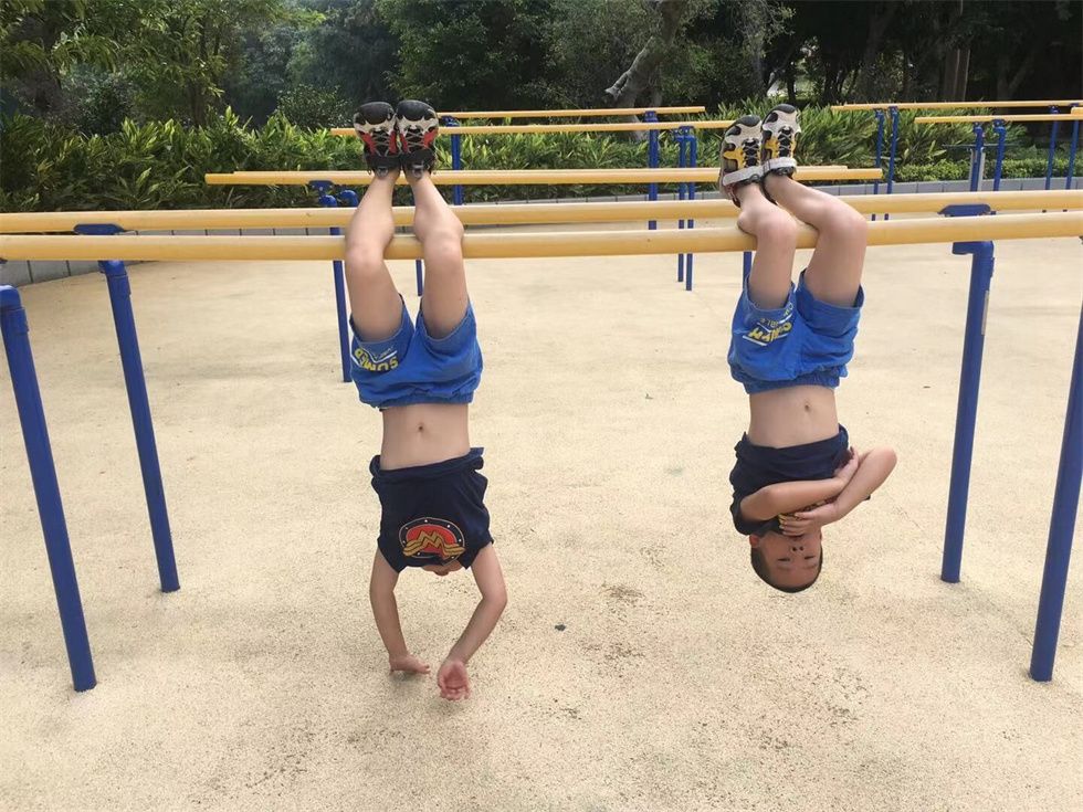 单双杠上的我们身轻如燕,倒挂金钩,练习臂力和腿部力量。