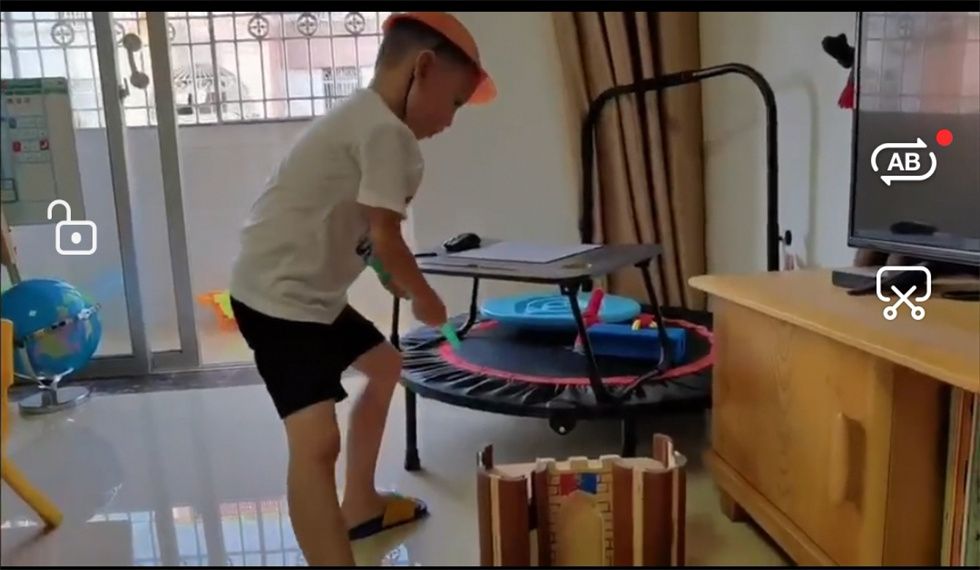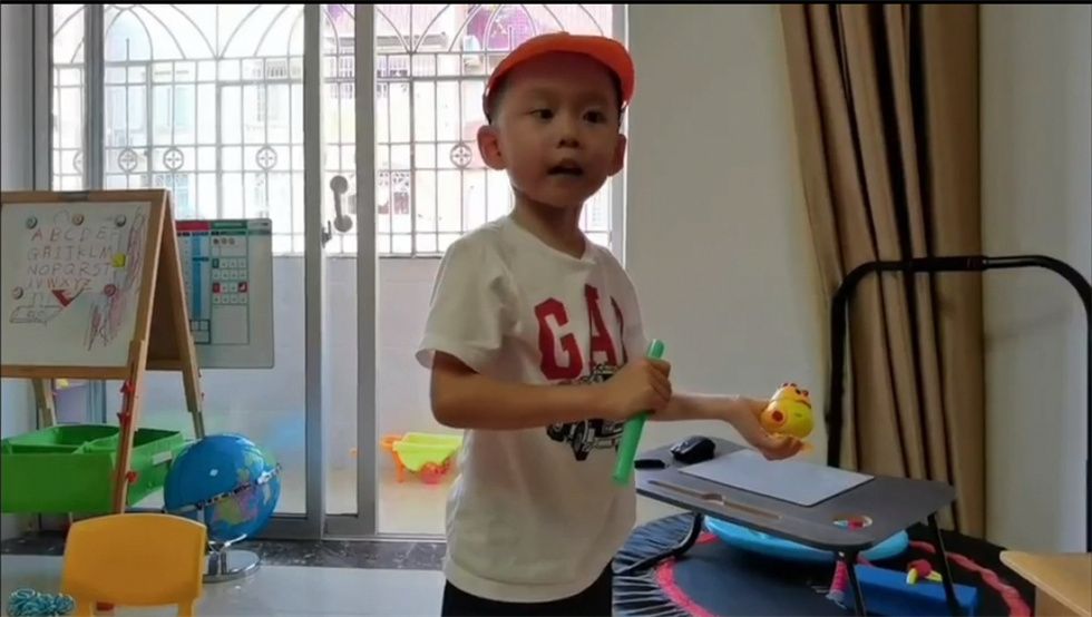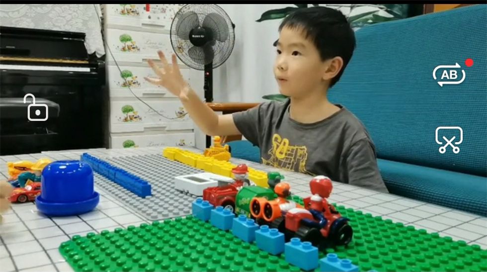 宥成小朋友在妈妈的帮助下,设计了一款益智游戏《数的拆分和组成》。在小视频中,他用小汽车玩具、骰子等做道具,演示了游戏规则,在简单易行的游戏中可以锻炼心算能力,增进数感的培养。
