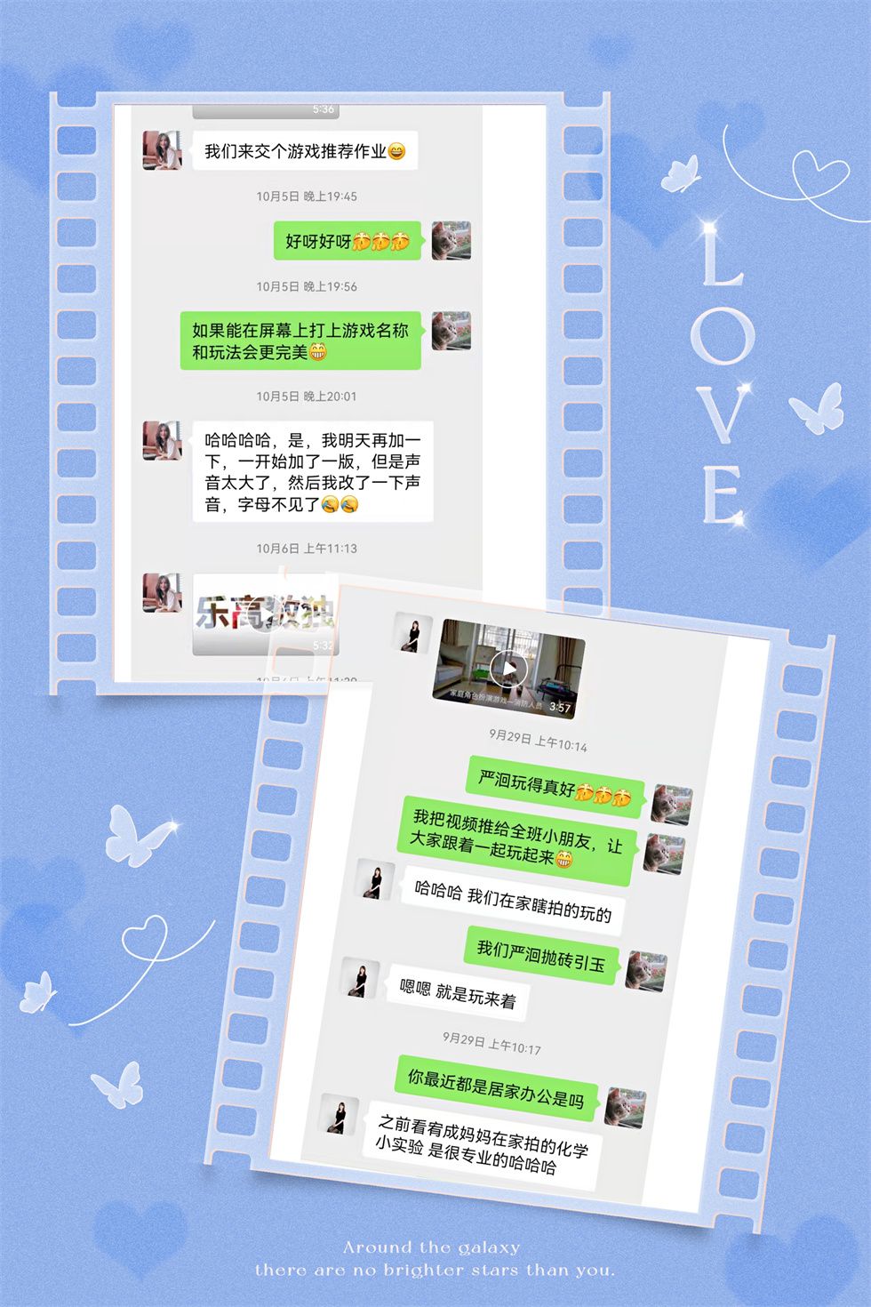 独乐乐不如众乐乐!疫情隔开的是物理的距离,却隔不开伙伴们交流的距离。通过线上聊天、视频分享、交流,小朋友们不仅在游戏“寓教于乐”中增长了知识技能,更在亲子伙伴“同玩同乐”中获得了充沛的情感支持。希望我们的游戏分享活动能够带动更多“网红小主播”,更多创意游戏,让小朋友的居家学习生活丰富多彩、其乐无穷!