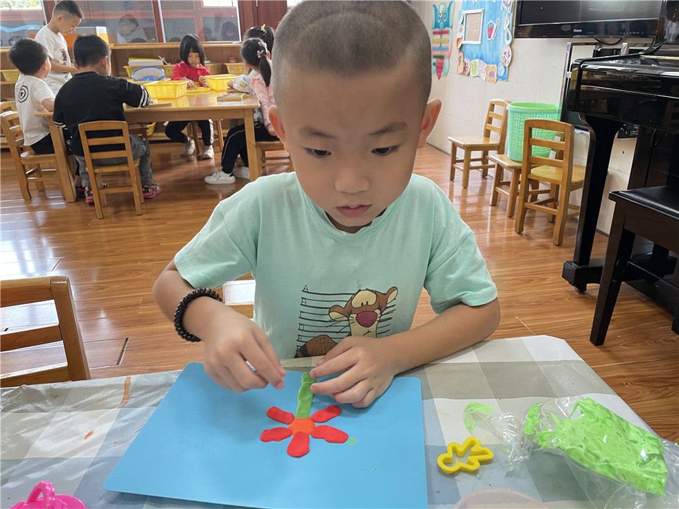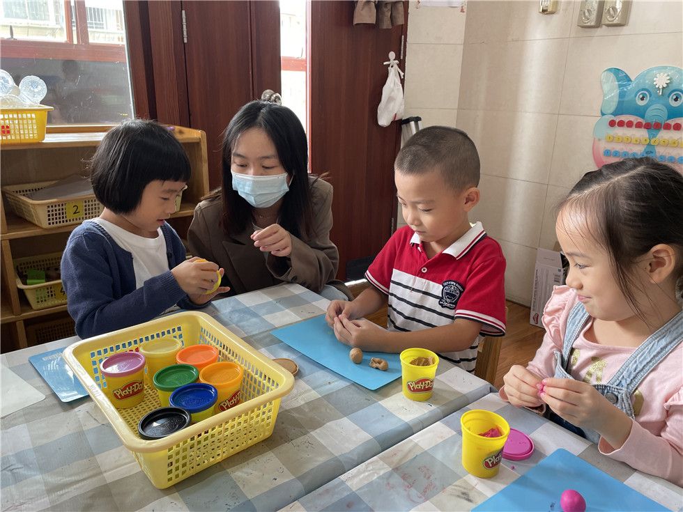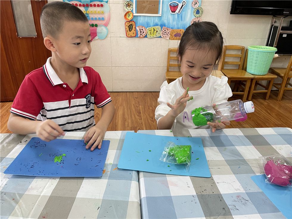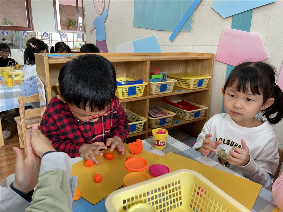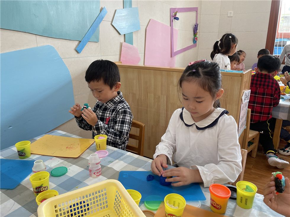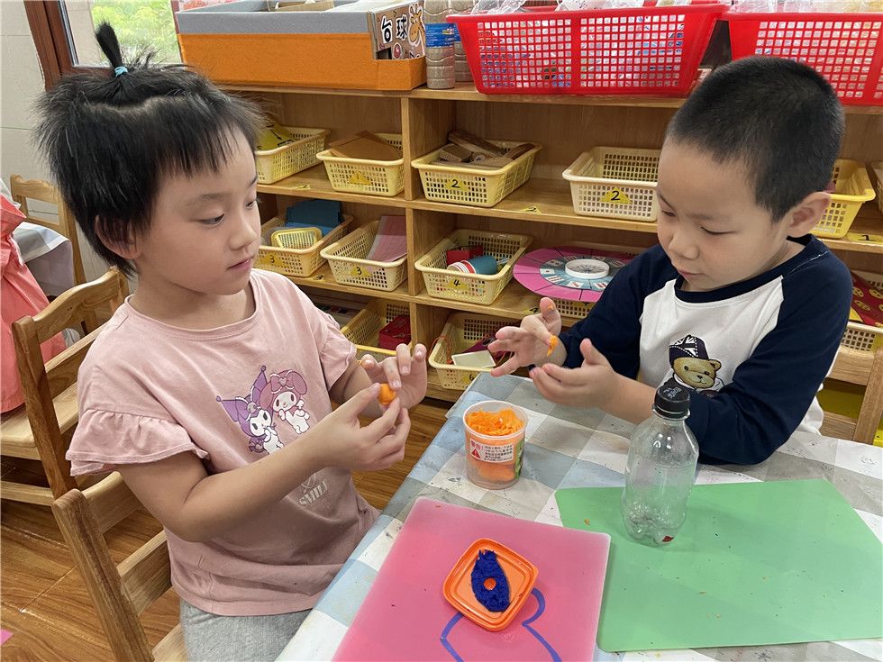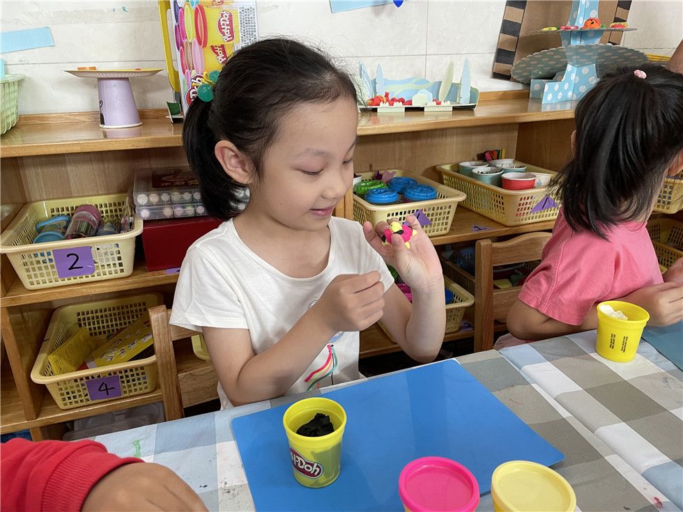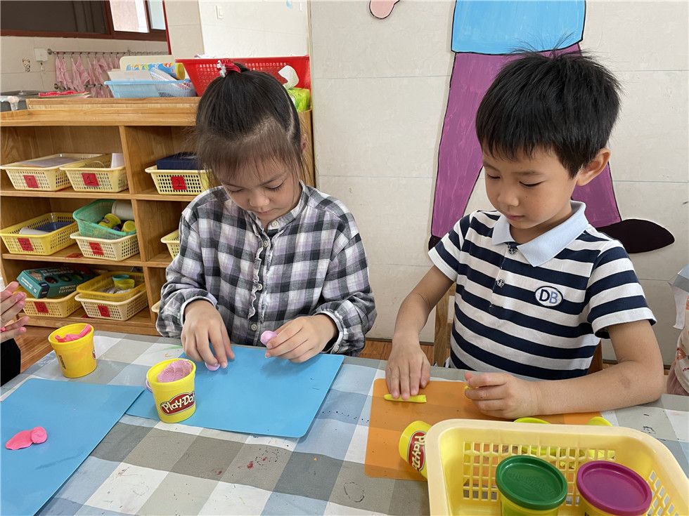原来,泥塑是这样创作出来的,好好玩哦!我们也忍不住要开始动手啦!看,我们每个小朋友都在认真制作着。“我想用橡皮泥捏我的好朋友言言,他是黑色的头发,今天穿了黄色的衣服,我想用橙色来做他的皮肤。”“我想要做胡老师和我两个人手牵手。”“姐姐你看,我做的是厦大幼儿园,这里是幼儿园的房子,这里还有海,这里是小山坡,是不是特别像!”