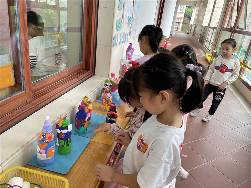 包仔爸爸的到来让我们变得更加喜欢泥塑,这不,我们又提议做一个以幼儿园为主题的泥塑创作活动。得到老师的允许后,我们就化身为泥塑大师开始新一轮的创作。小伙伴三两俩下就把作品作品创作,每个作品都是独一无二的。“瞧,我把瓶子用泥土围住,做个蓝色的天空,底下是草地,转过来就是小山坡。”“我做的是淘气堡,绿色的地板,上面是我最喜欢的秋千”。“还有我的,这是很早以前的幼儿园,因为之前幼儿园时蓝色的很漂亮,上面还有小窗户,我还把屋顶做成了三角形。”
