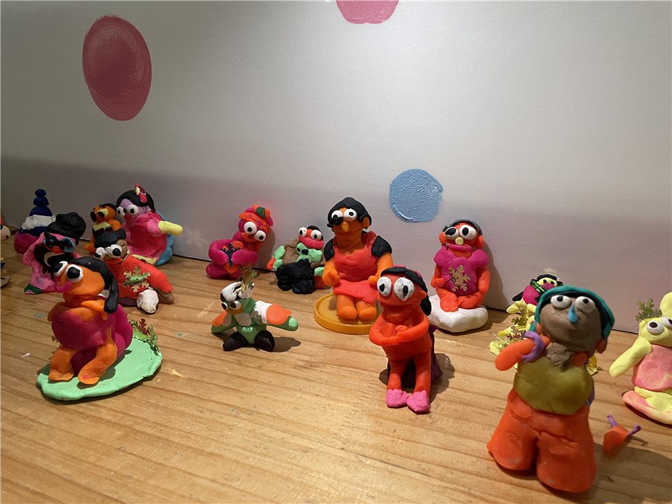 瞧,我们正在学习怎么做泥塑呢!包仔爸爸告诉我们要先选择一种颜色的粘土将它搓成不同的形状,做身体的各个部位,然后就可以开始制作衣服和头发了。制作衣服和头发时要记得在桌上将粘土按平,再使用泥工刀把衣服和头发刻出来粘上去。最后还可以使用泥工刀在头发上雕刻出纹路噢!