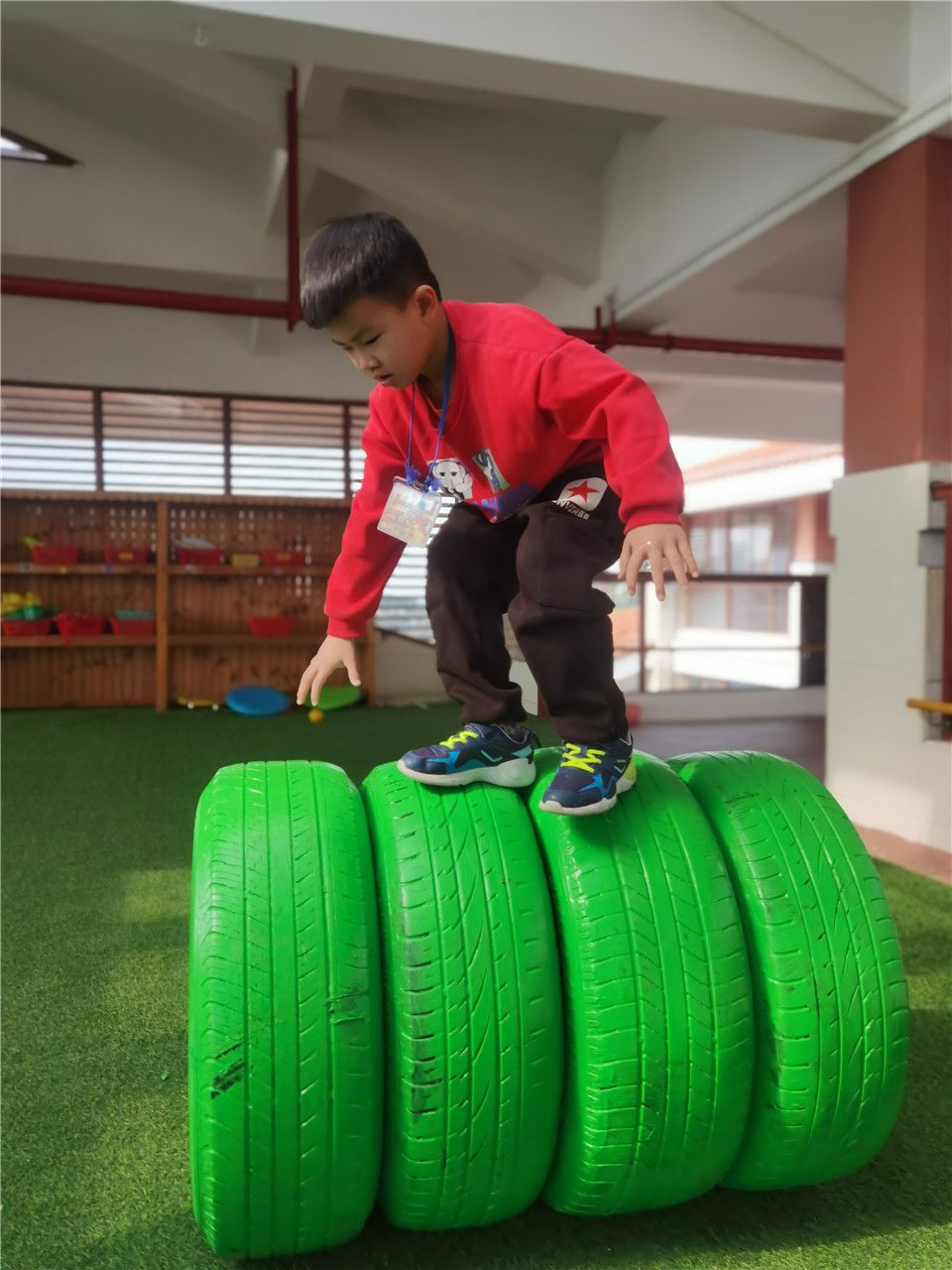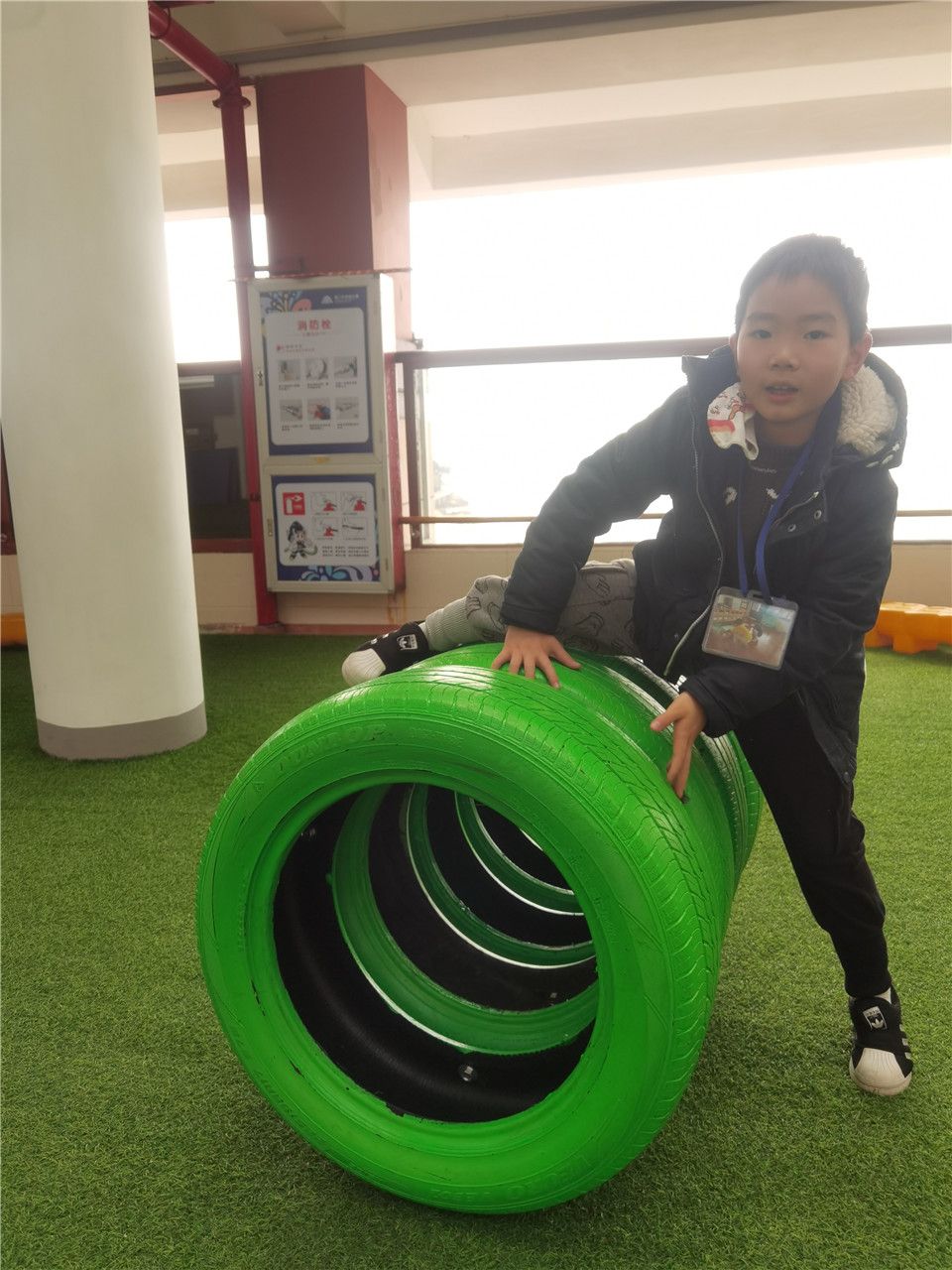 而一边的俊皓小朋友正对着眼前这个绿色的庞然大物—轮胎大滚筒直叹气:“我怎么一直爬不上去呢,怎么才能爬上去呢?”一次又一次的尝试,他终于他站在了轮胎滚筒上了,“啊啊啊,我成功啦。”话音刚落,他又掉下去了,于是,锲而不舍的他又开始了一次征服绿色大滚筒的游戏中。