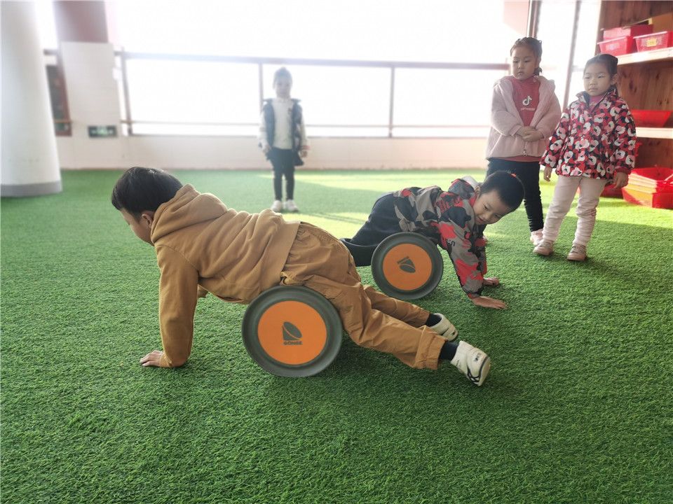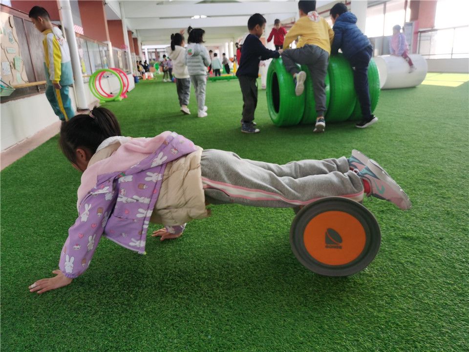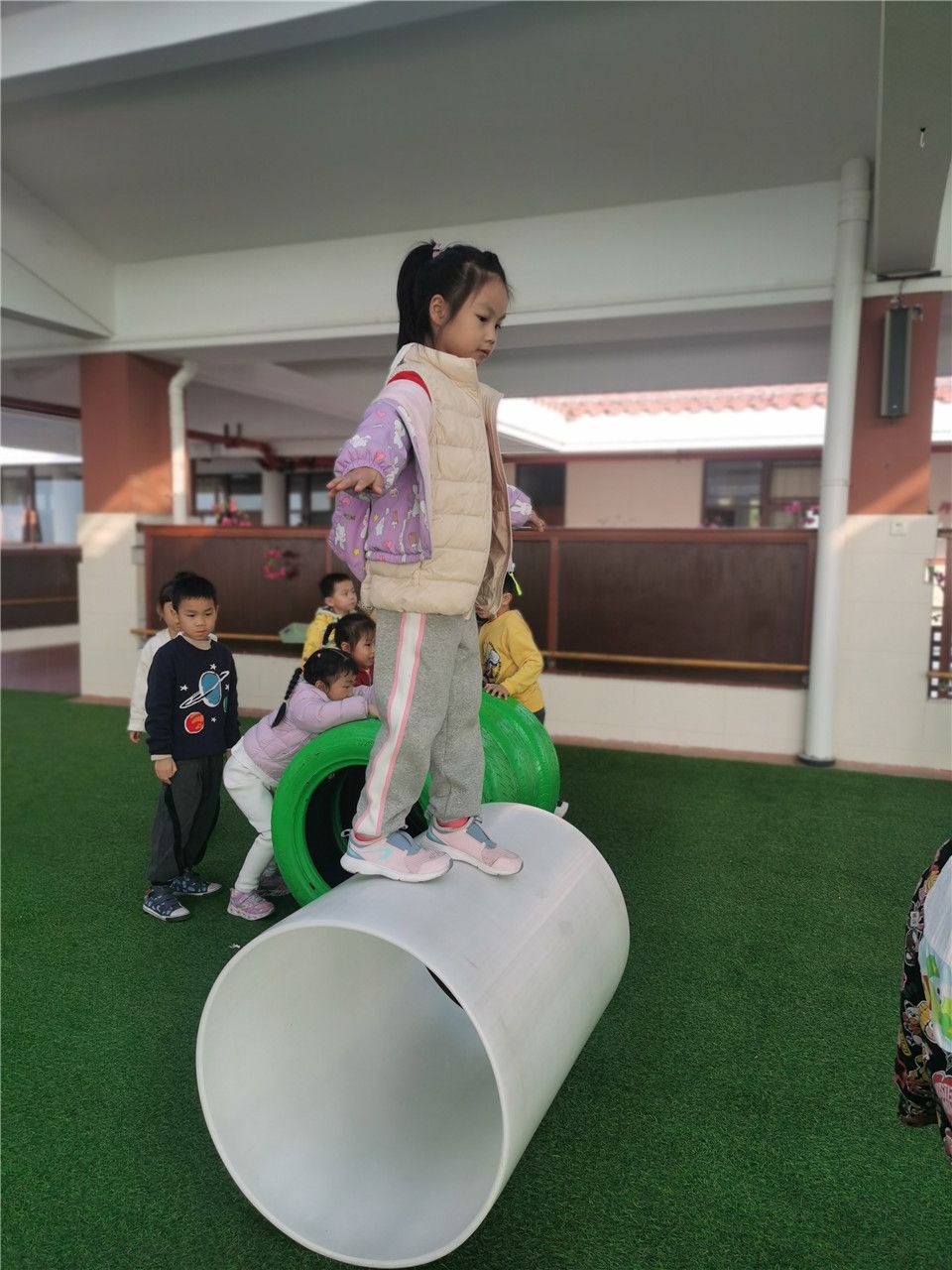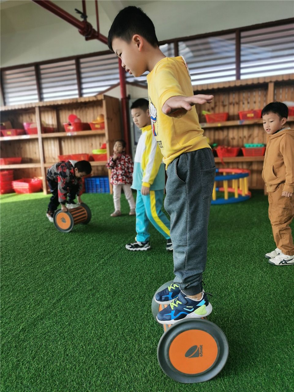 伊锘、璟昱几个小朋友像个杂技演员,只见他们灵巧地爬上大滚筒,伸出双臂保持着平衡,双脚交替着往前蹬,听话的滚筒在她的脚下转动着,引起一旁小朋友的一片赞叹。