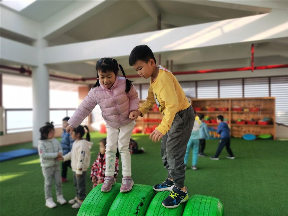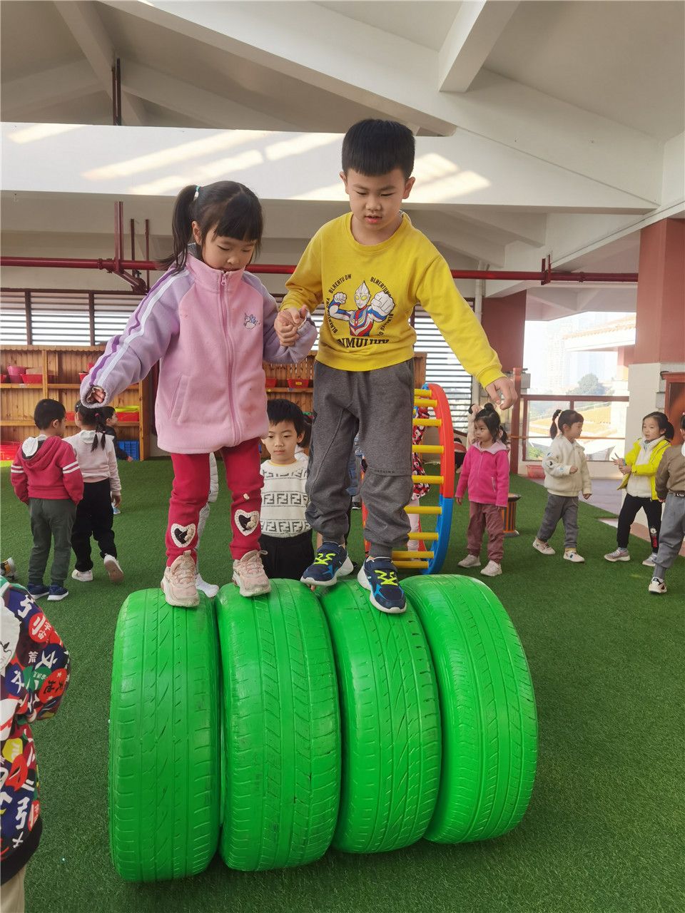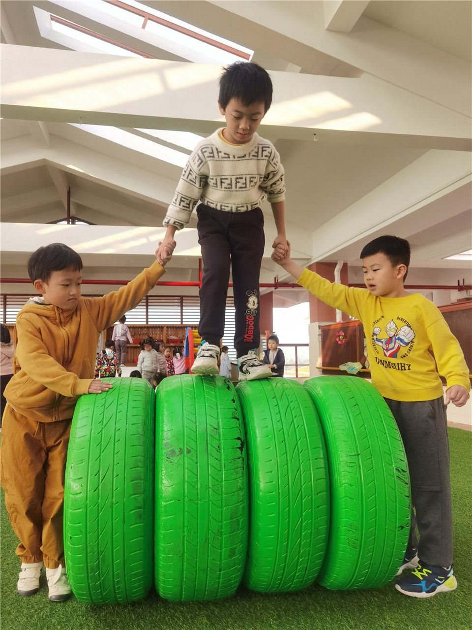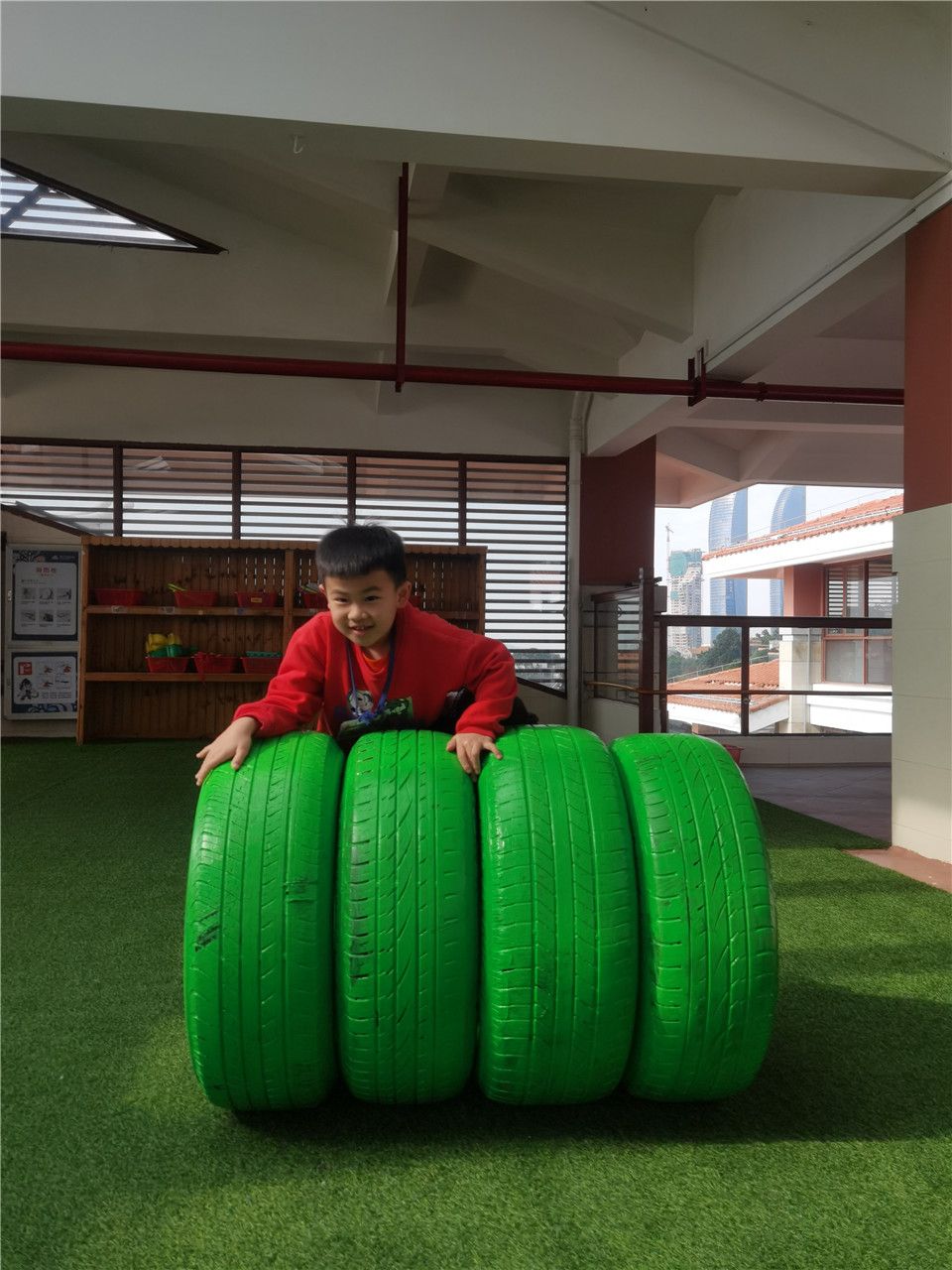 自从天台的大体能锻炼区增设了滚筒游戏材料,它就成了小朋友们的最爱,玩得不亦热乎:白色大滚筒、绿色轮胎滚筒、花式滚筒和迷你小滚筒,大家各选所需。
