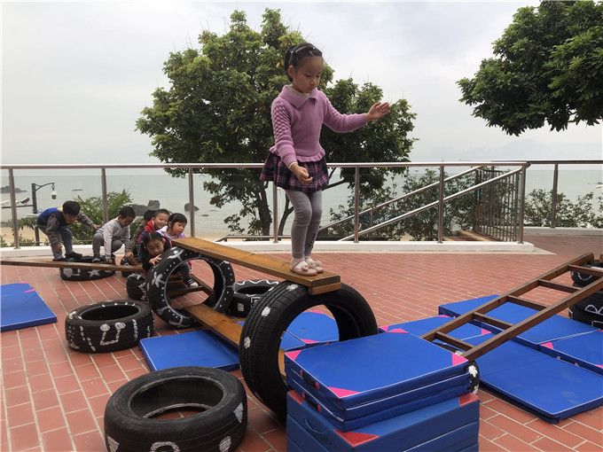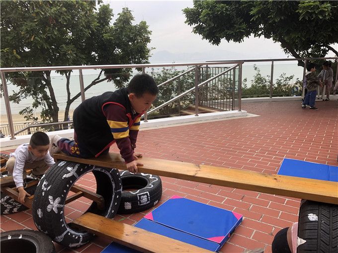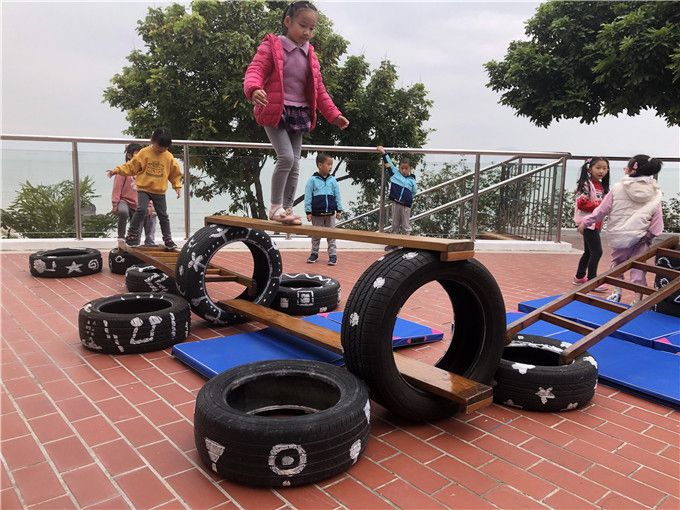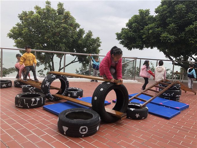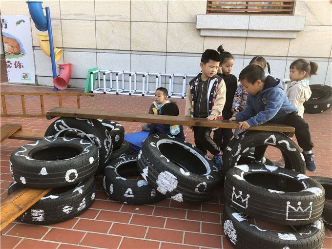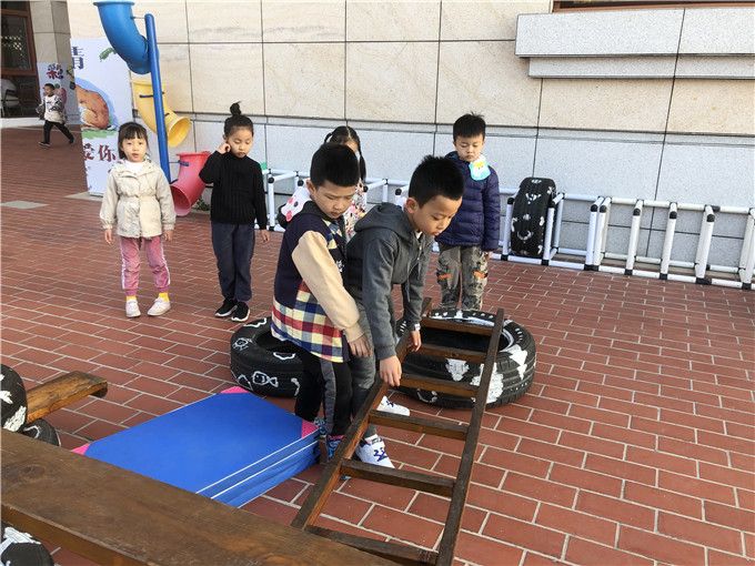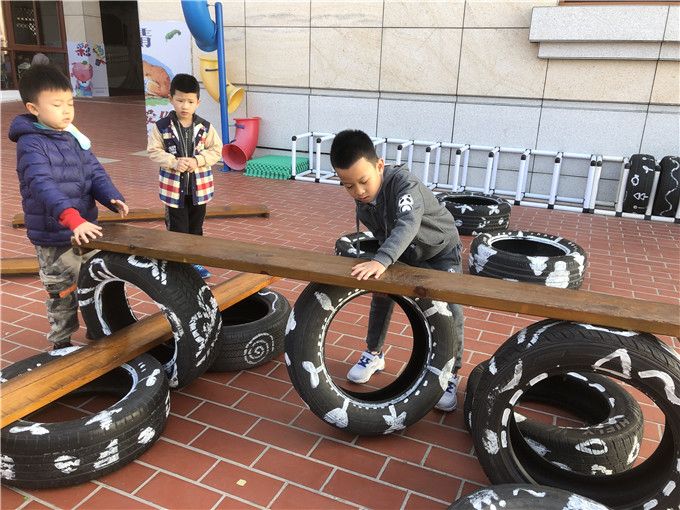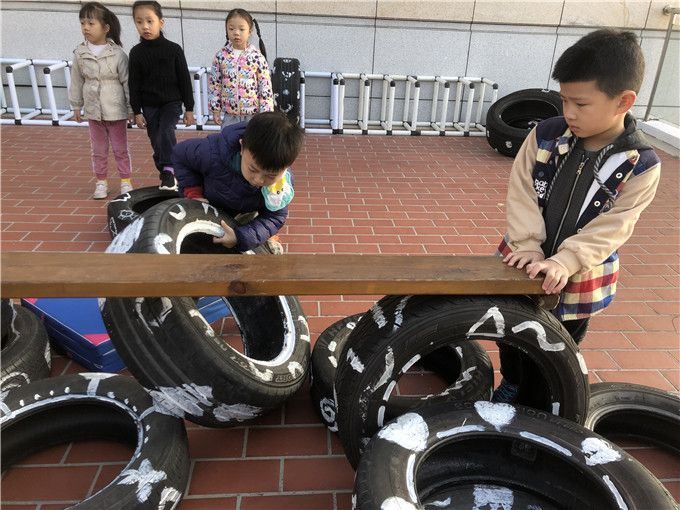 为了让计划付诸实施,幼儿们早早来到幼儿园,在组长的带领下,开始了木梯、轮胎的组合探索。