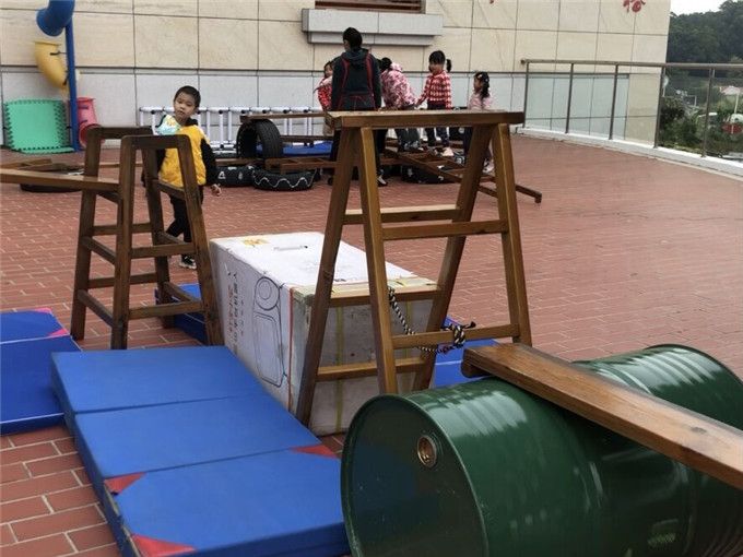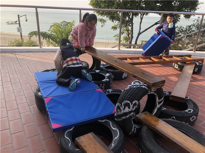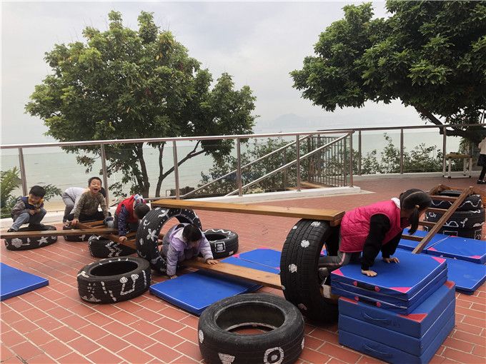 爬着过独木桥,从轮胎里钻过,降低一点难度,我们也玩得很开心。