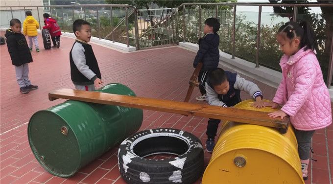 在玩转木梯、轮胎、地垫组合后,我们又把目标转向低结构材料。到楼下结构游戏时,文博看到了废弃的纸箱,说:“林老师,这个纸箱我可以爬上去,你信吗?” 说完很麻溜地翻身上去。对了,纸箱也可以成为我们木梯组合的“新鲜血液”哟。还有啥也可以用来组合?山坡上的油桶也成为了孩子们的新宠。