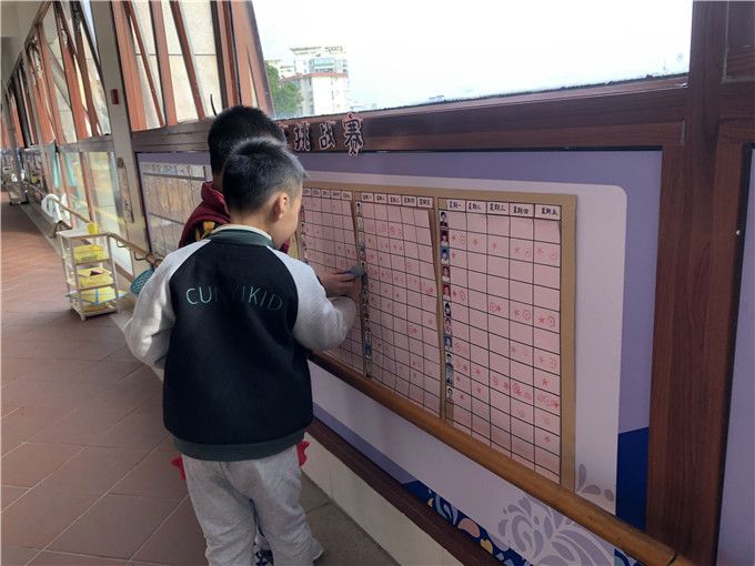 每天活动后,幼儿为自己今天的表现作出评价,带上手环并在班级互动墙上盖章,一次次为自己鼓劲加油。