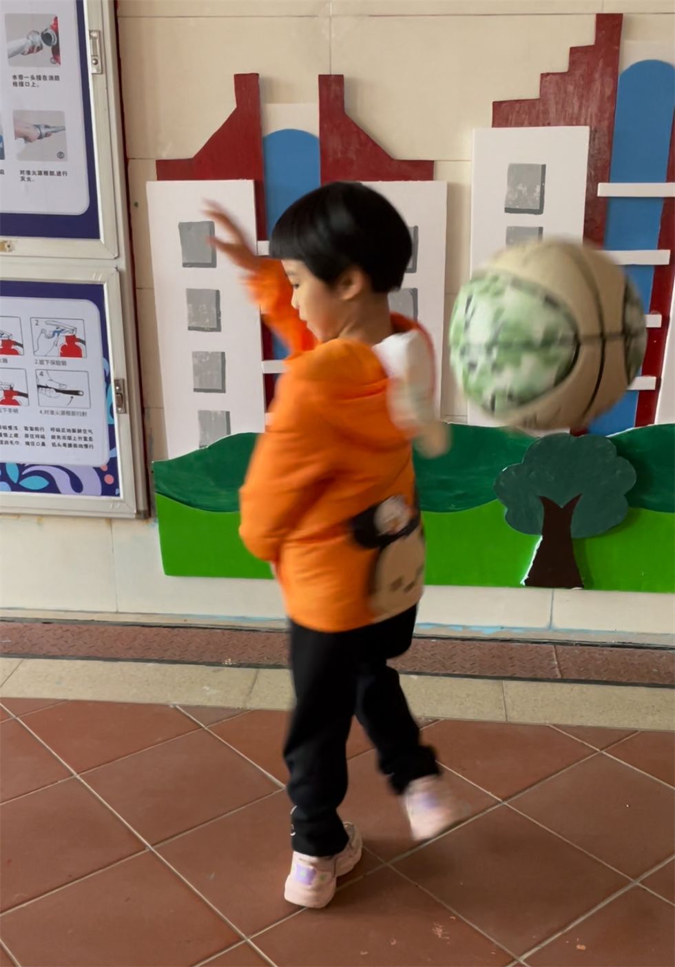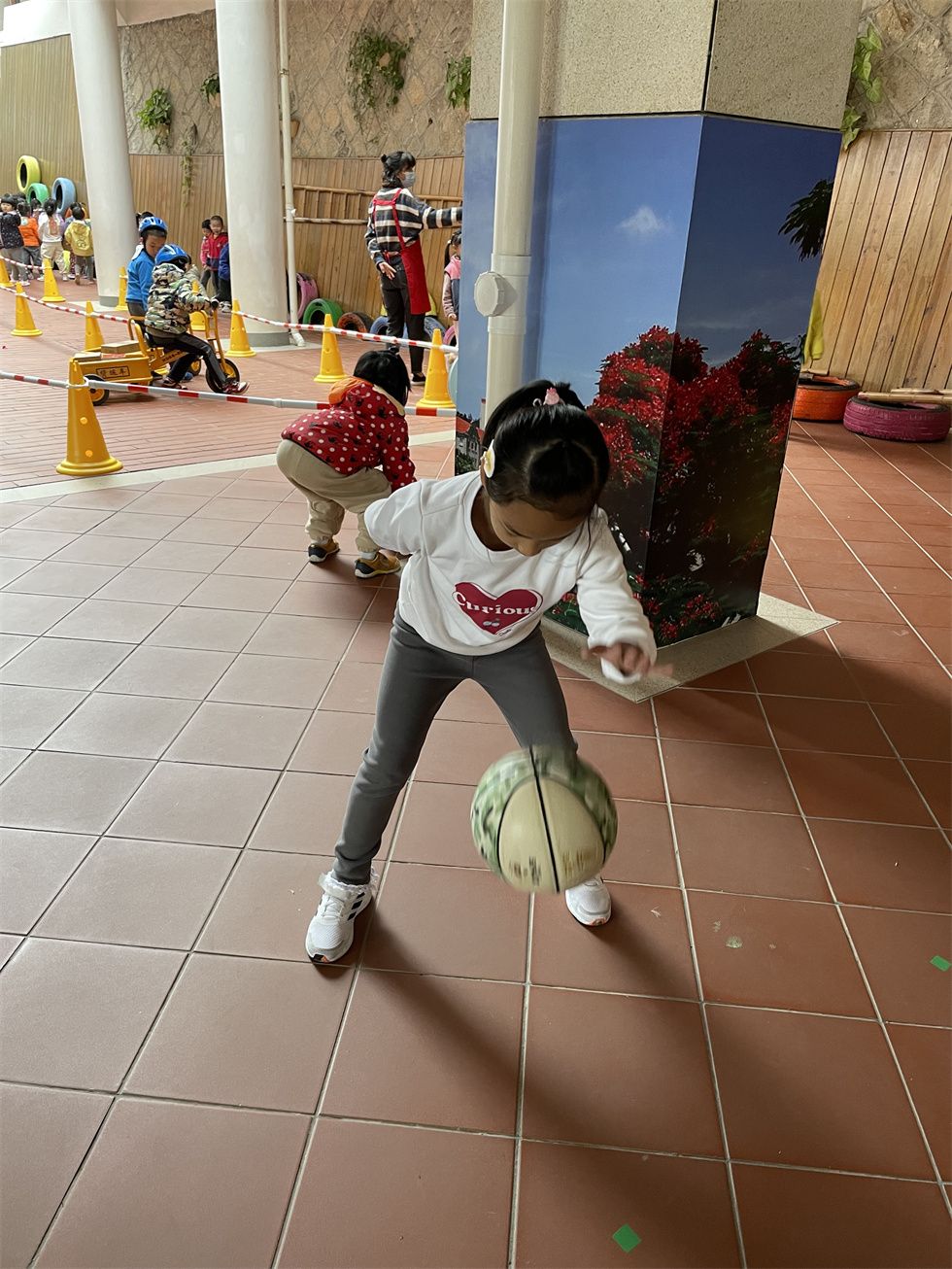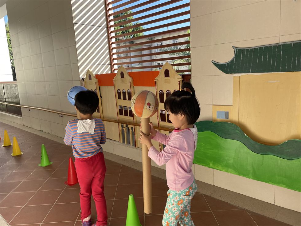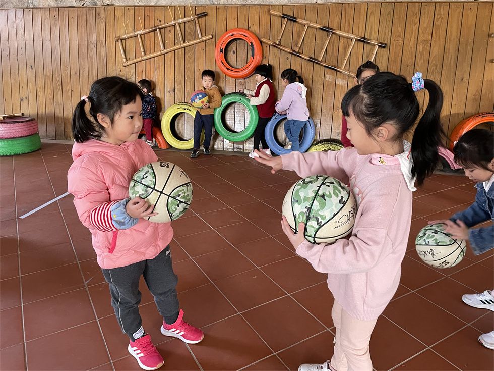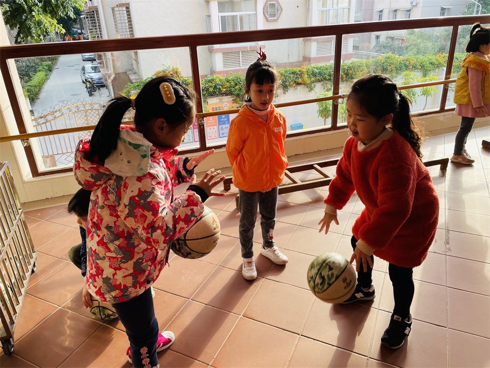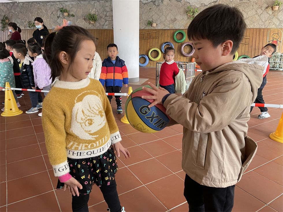 这时,中班的弟弟妹妹们也被吸引了目光。大二班孩子们也充当了一回小小篮球教练,“投篮时腿要微曲,球要放在胸前,看准篮筐哦;拍球时,眼睛和身体要始终跟着球移动,集中注意力哦。”