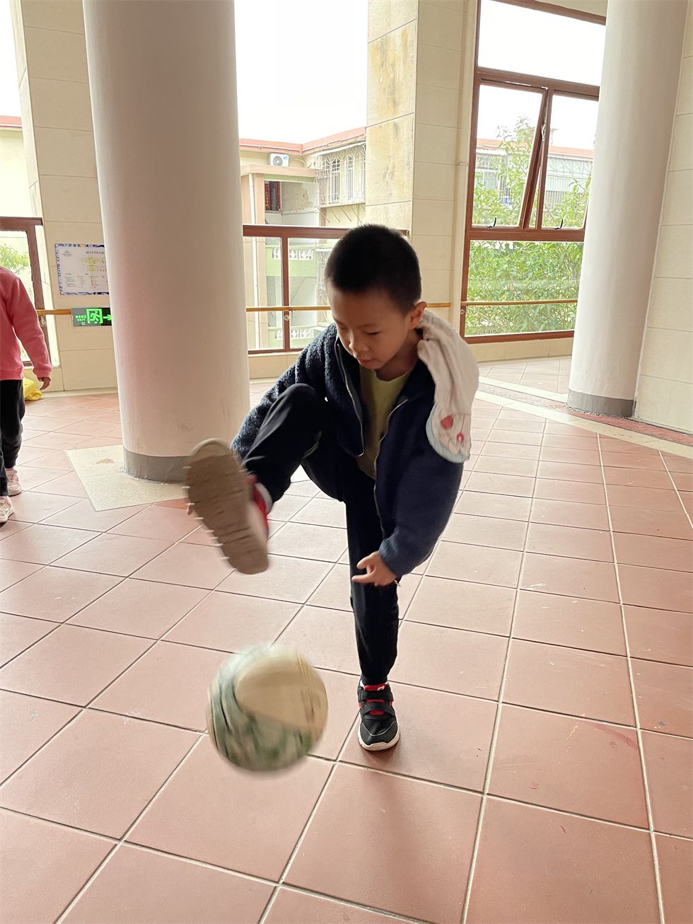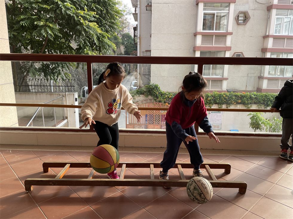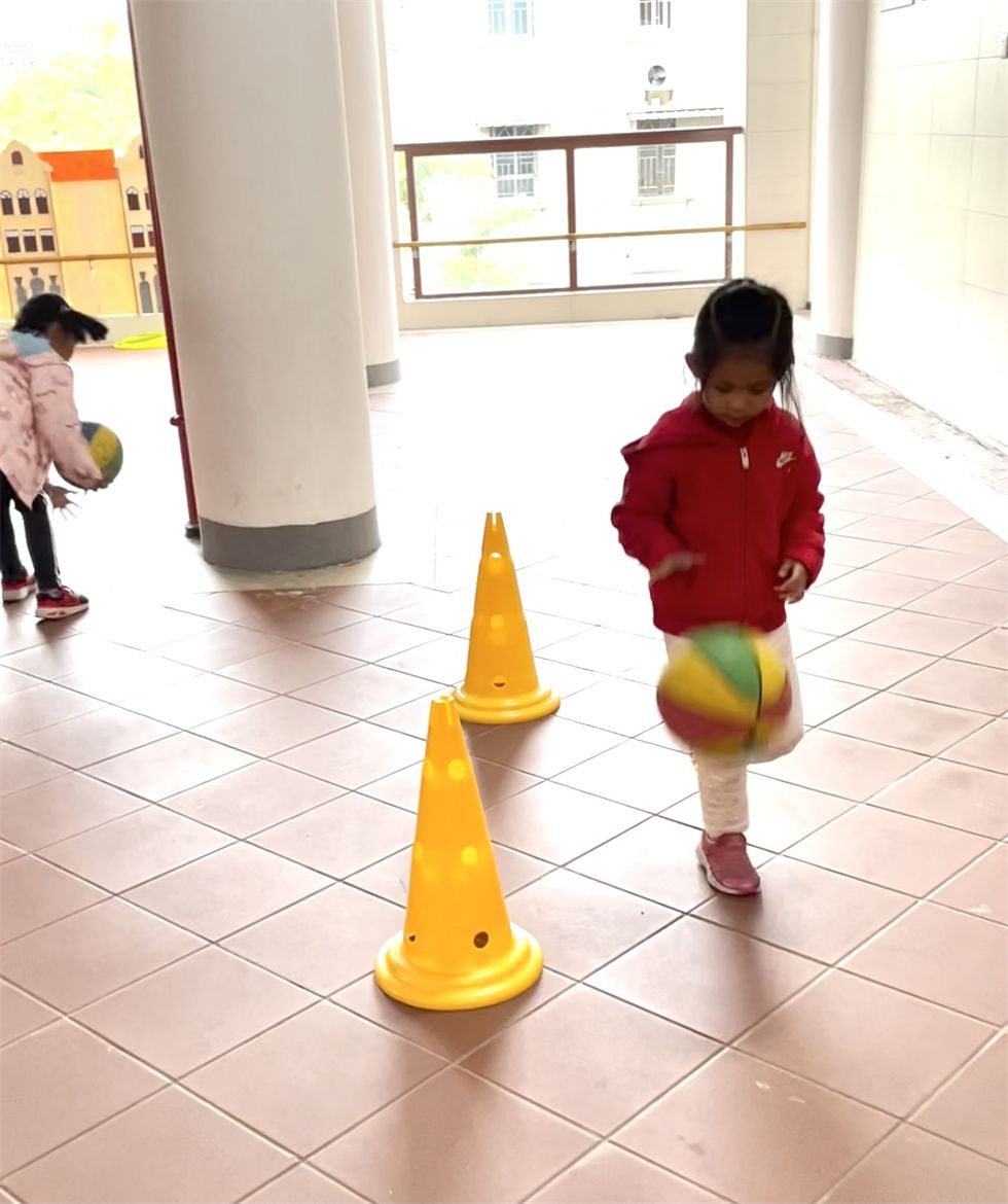 当孩子们能将球自如的控制在自己的手中时,瞧!他们又升级了拍球难度呢。