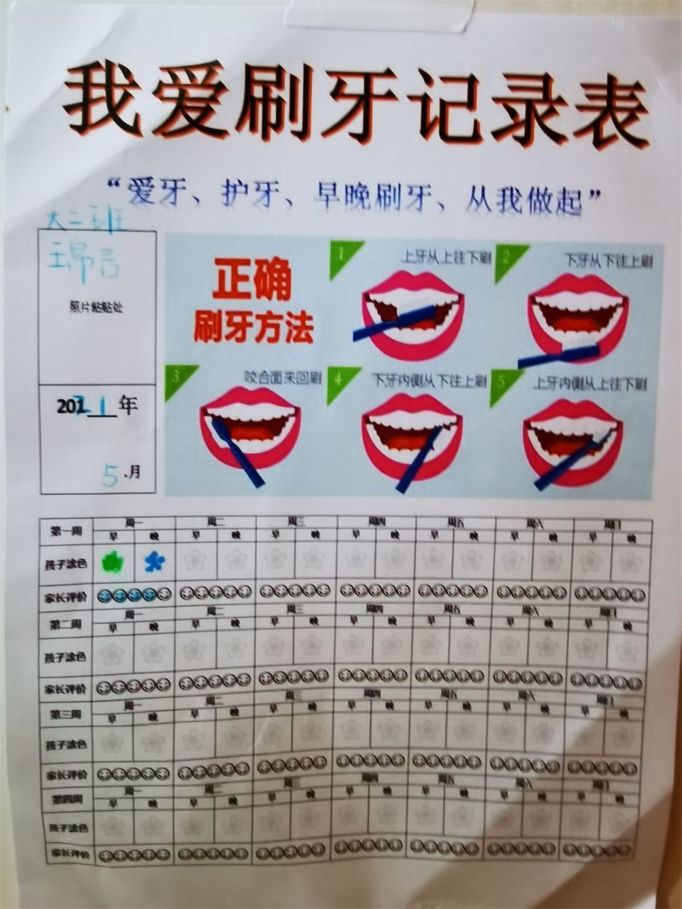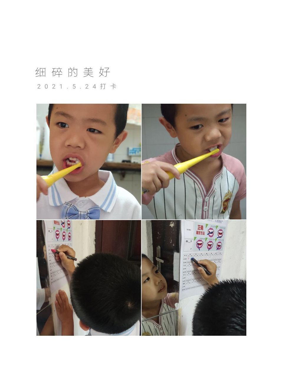 看完童话剧,孩子们都说以后要坚持早晚刷牙、养成饭后漱口、少吃甜食的好习惯,只有牙齿健康,身体才会棒棒!我们的刷牙打卡活动开始啦!我们每天吃的东西很多,要把牙齿刷得干干净净的才行,否则会有蛀牙的。所以孩子们每天都坚持早晚刷牙,接下来让我们来看看孩子们的刷牙情况吧!
