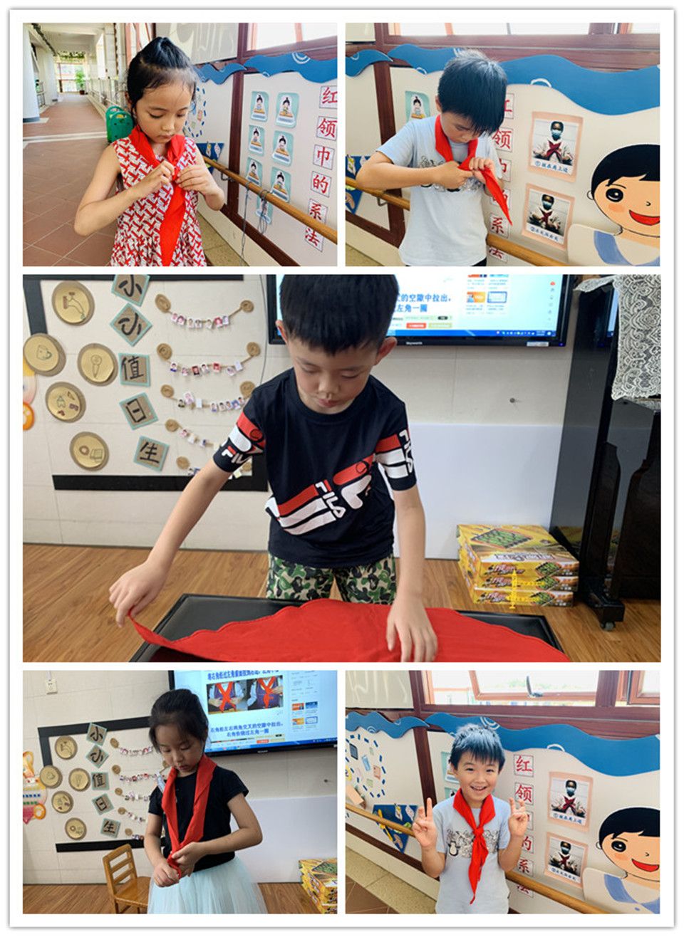 红领巾也是成为小学生光荣的象征。瞧!孩子们对系红领巾可是兴趣十足呢!