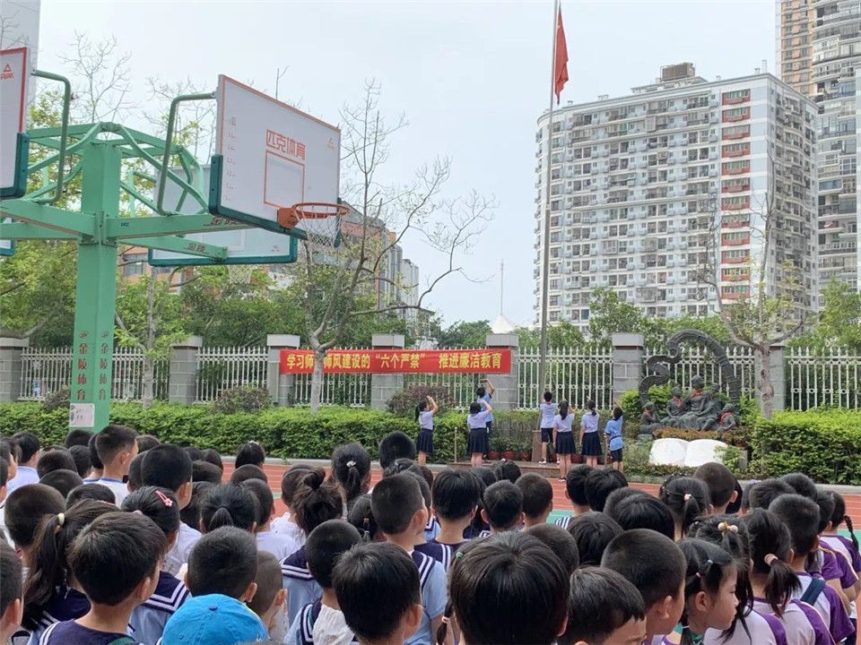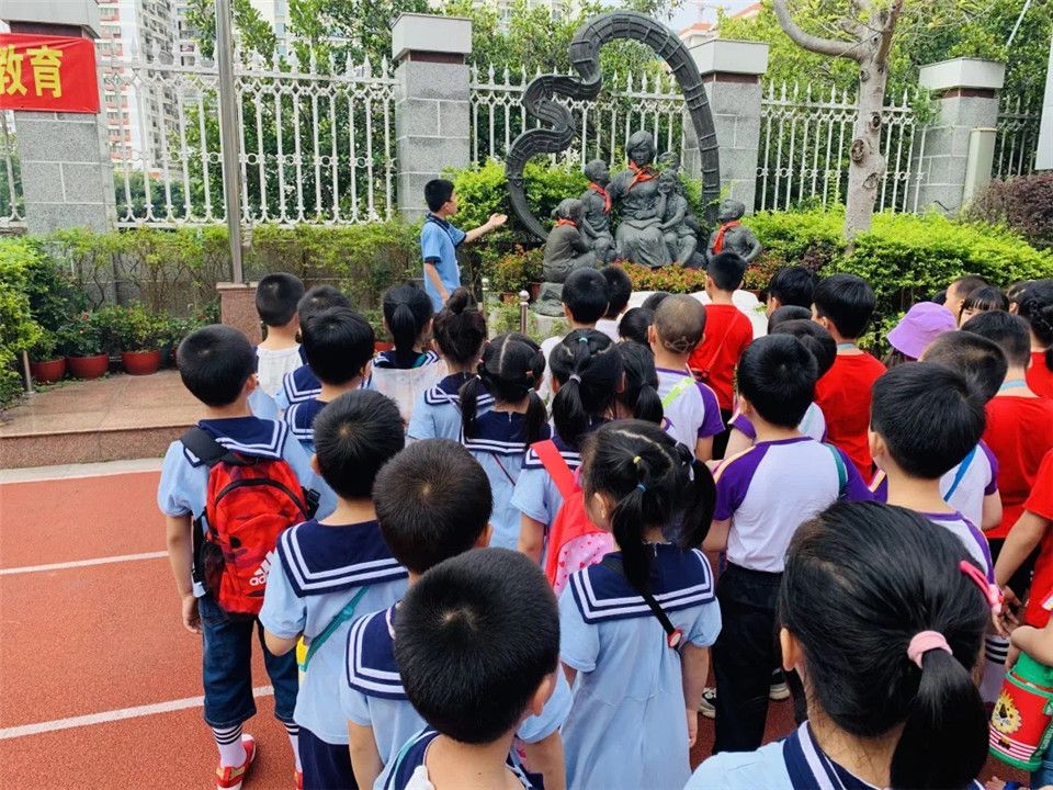 映入眼帘的,就是大大的操场,高高的升旗台,富有意义的雕塑和墙面.....孩子们目不转睛地参观着。