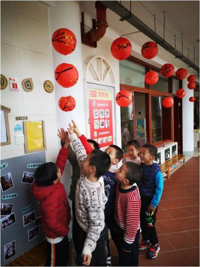 孩子们画完了,和睿睿妈妈一起把灯笼挂在了走廊上。不时地与旁边的小朋友悄声议论几句。一盏盏灯笼高高挂起,远远望去,形成了“月华连昼色,灯景杂星光”的瑰丽景色。