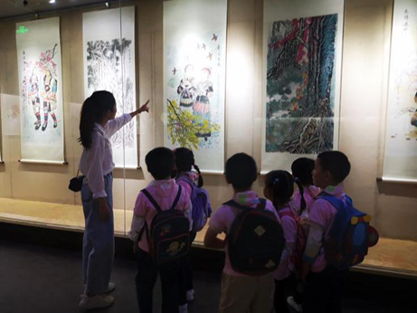 秋游啦 !沐浴着温暖的阳光、唱着欢快的歌曲,大六班的孩子们开心地来到了文化艺术中心。走近书画展区时,几个孩子像发现新大陆似的:老师,快看,这幅图上的牡丹花真美啊。其它孩子听见了,也兴奋极了,围着展示柜叽叽喳喳,问题也不断涌了出来:“这是什么画呢?”“这种画画的纸张好像和我们平时绘画的纸张不一样呀?” “我发现这竹子颜色有的淡、有的浓,淡的好像离我们很远,浓的好像离我们很近。”孩子们七嘴八舌的议论着。对于一个新鲜的事物,兴趣是幼儿最好的老师,幼儿对水墨画的兴趣,是幼儿学好水墨画的基石。