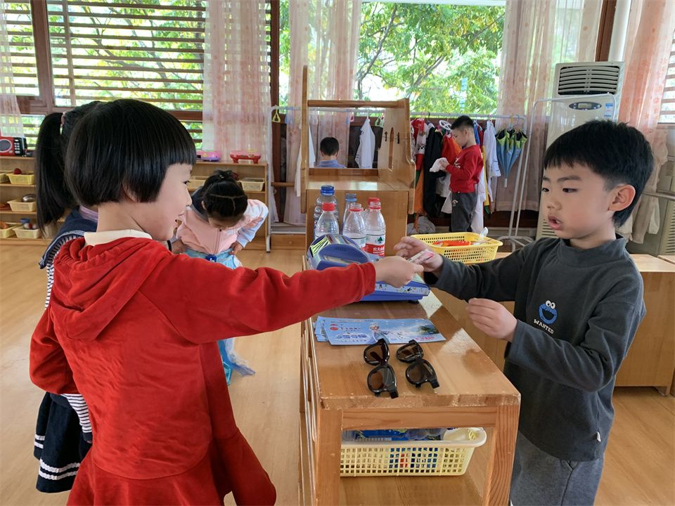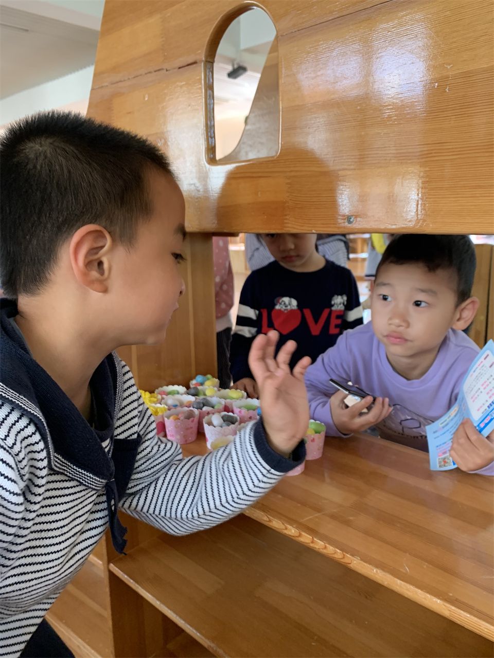随着电影院的顺利开张,越来越多的孩子开设了类似的区域,比如:游乐场、动物园等。我观察到孩子们在游戏中把在电影院里曾经遇到过的问题都找到类似的办法解决了,比如:游乐场、动物园等都制作门票,让顾客排队买票:在设置游乐场时巧用桌椅和标示隔断不同游乐项目、等候区;并且善于以物代物。