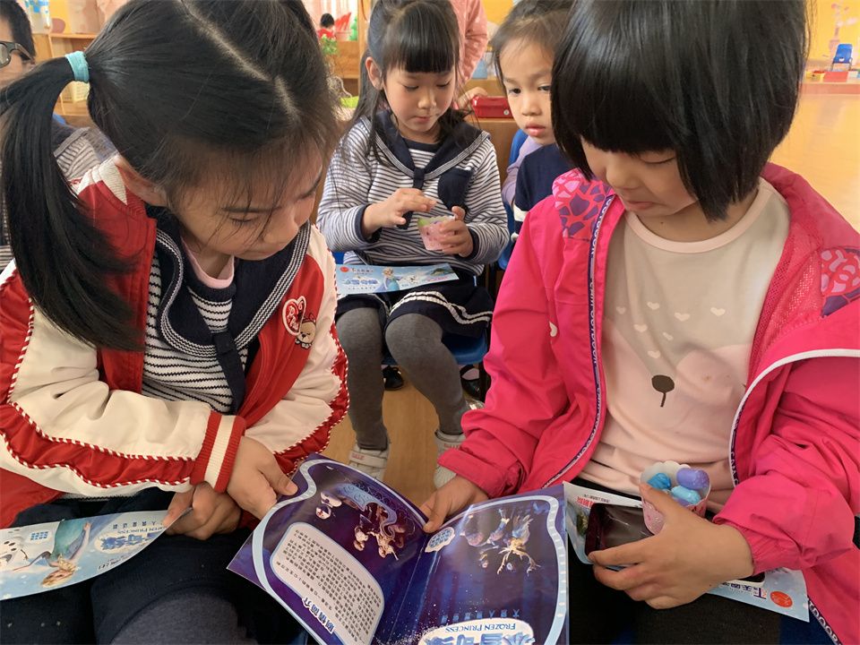 小小售票员曼曼跑去隔壁的娃娃家,开心地介绍大家介绍:“今天上午10::00播放的电影是“冰雪奇缘”哦!今天第一天开业,买电影票还送爆米花和可乐。大家快去看!”