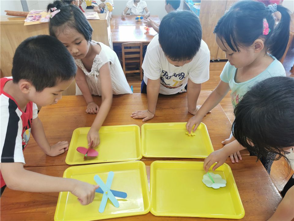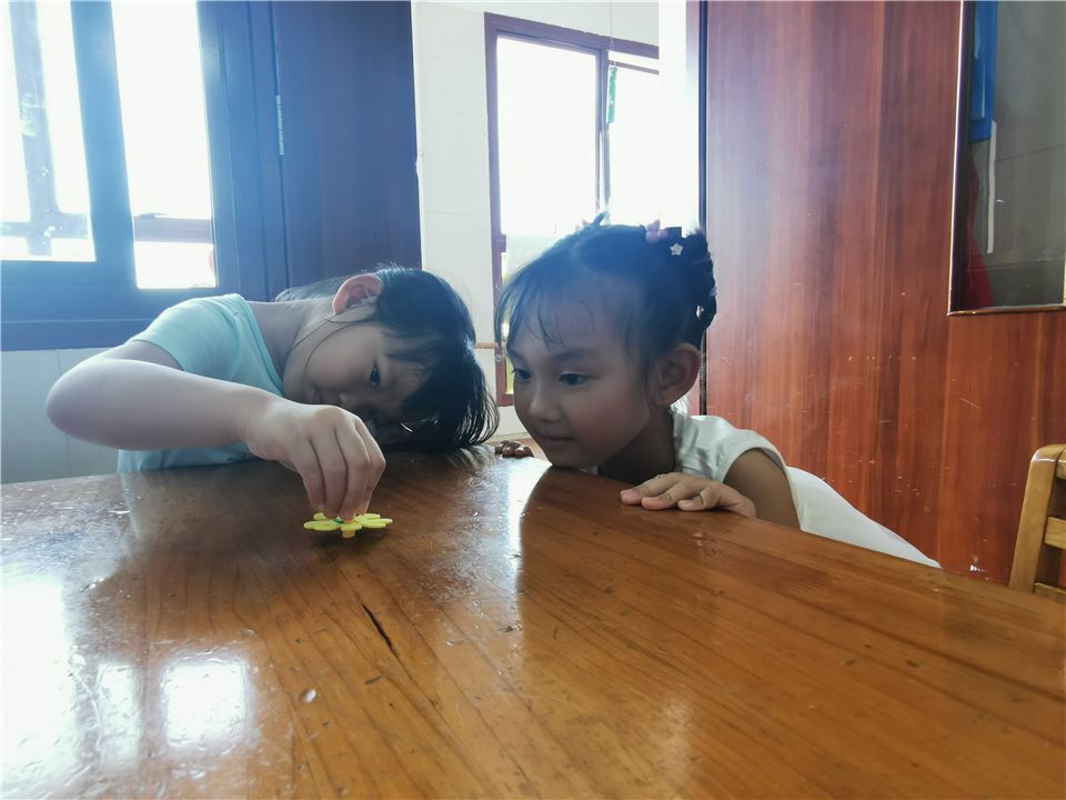 在玩桌面游戏时,哲旭和思晔用玩具拼了一个陀螺,两个人放到地上比赛谁的陀螺更好,阳阳、笑笑和睿睿也兴奋地围上来观看,孩子们一起讨论着谁的陀螺转的更久,转的更远......于是一场追随着孩子们的兴趣和经验出发的陀螺探索之旅开启了。