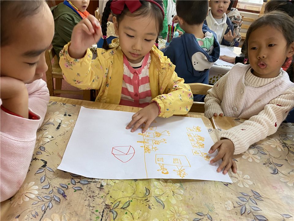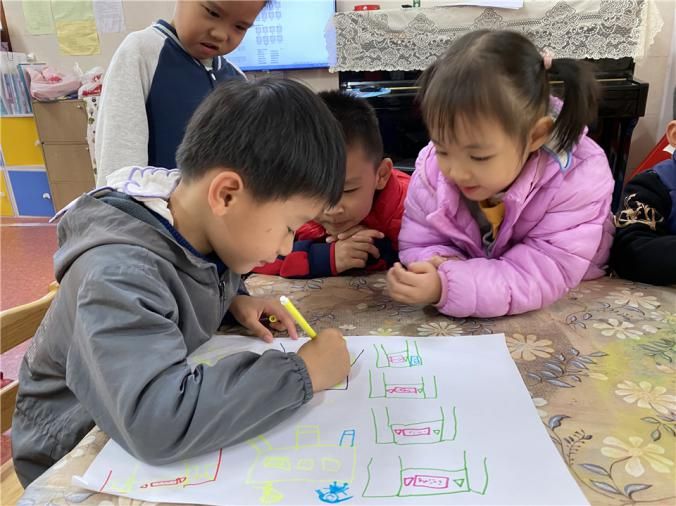 可可说:“我看哥哥姐姐他们的桌子都分两边摆放,我们也要分两边,不一样想法的孩子们分开坐一起,我把桌椅画上去!”安然也说:“每张桌子上都有一个三角形的牌子,还写着不同的字,我都看不懂,不然我先画上去,一会我再问问张老师,到底要写些什么呢”梓辰接着说道“那中间上面的一张桌子呢?是大人坐的,你怎么没画?我知道那是评审坐的地方,你可别忘记哦!”在孩子们分组做好辩论赛计划后,小白拿着小组小伙伴画好的计划图,左看右看,最后撅起了小嘴巴问元元:“这个中间的孩子是什么意思?他在干什么呀?他为什么嘟起嘴巴?桌子上红色的三角形牌子不是要写上字吗?你漏掉了吗?为什么你画了小花和正方形在上面?代表什么意思啊?”小杰也凑过来说:“感觉这个不对呀!怎么和我说的不一样呢?”我便开始观察每组画的计划图,倾听孩子们之间的交流,发现每组都存在同样的情况,都有个别孩子不理解辩论赛,没明白小伙伴画出来的意思。