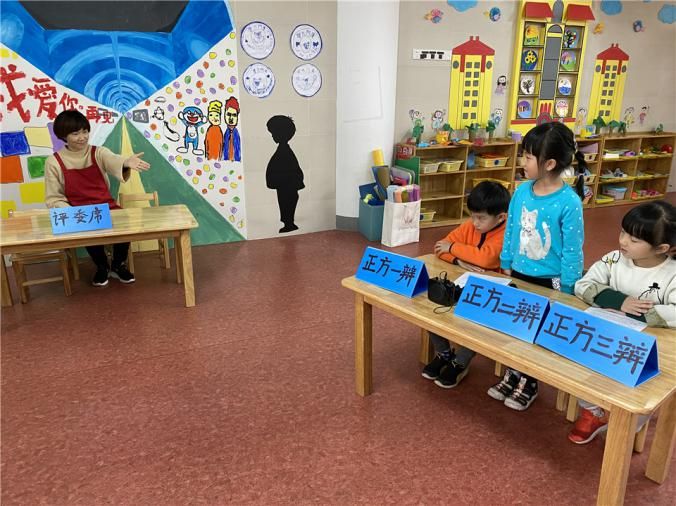 一次午餐后的自由活动时间,小杰不小心将玩具陀螺弄坏了,正准备往教室走去寻求老师的帮助,栋栋看到了马上说:“不行,自己的事情自己做,你要自己修。”其他的孩子们听到动静了都马上围过来加入讨论。大家你一言我一语的,围绕着“到底要不要请老师帮忙?”各抒己见,我们发现孩子们对“遇到困难请老师帮忙”这个问题都有着自己的想法,便对孩子们说:“你们的讨论很像一场辩论赛哦!” 茹茹问:“什么是辩论赛?”荞荞说:“就是你一句我一句,最后看看谁赢!” 晴川说:“这很像我爸爸在法庭上的辩论,他在法庭上就是像你们这样跟对方争辩,真有意思!”茹茹:“听起来很好玩!老师,我们也想玩辩论比赛。”没问题!班级“辩论赛”就此开始啦。