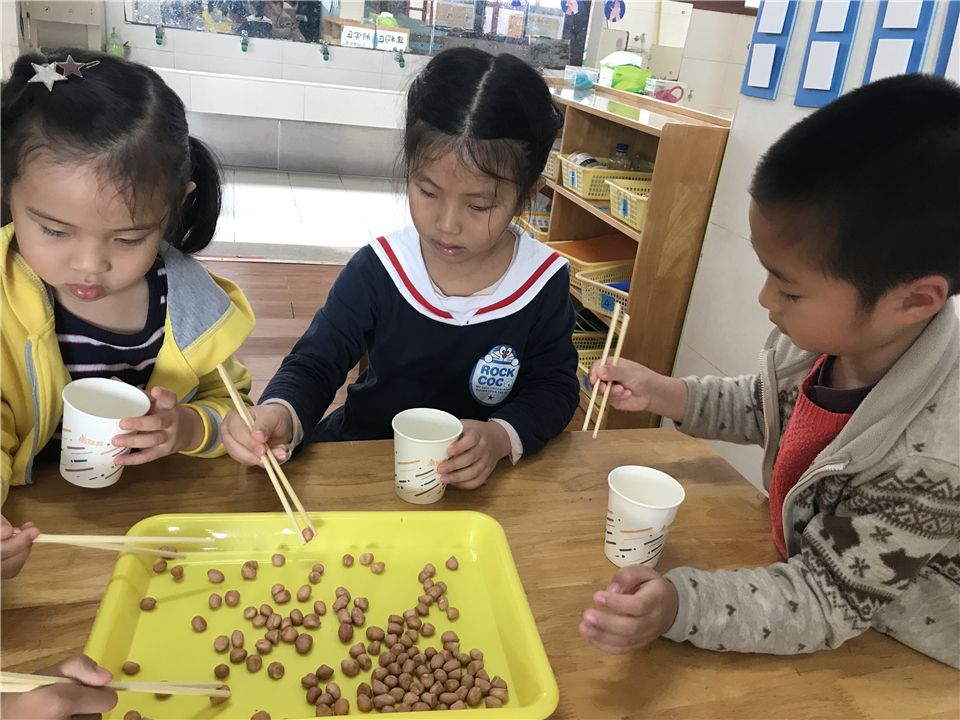 孩子们在游戏中学会了筷子的使用方式。刚开始还不太熟练,用筷子姿势还不够正确但是孩子们并没有放弃,在一次一次的游戏中逐渐学会。