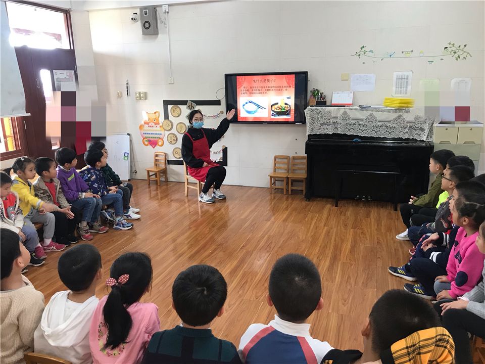 瞧,大五班的孩子们认真地听着关于筷子的历史,学习正确的用筷技能,并且迫不及待地想要动手试一试。