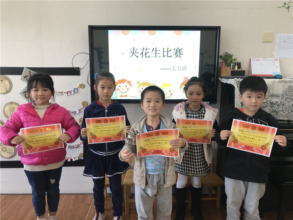 比赛夹杂着小选手紧张地呼吸声和小观众的加油打气声一轮一轮的进行着。比赛结束,终于要公布获胜的小选手了,孩子们激动不已道:“老师,有我吗?我获胜了吗?”最后夹到花生米最多的五位小选手得到了“用筷子小能手”的奖状,没有获得奖状的孩子们也都获得了一个鼓励的贴贴纸,孩子们脸上都洋溢着比赛的喜悦,期待下次再进行别的比赛!