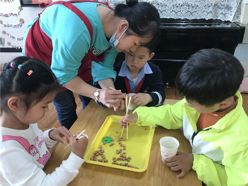 终于可以动手实操啦,孩子们激动不已。有的孩子平时在家用筷子吃饭,已经能够熟练的使用筷子;但有的孩子还是第一次使用筷子,不知道该如何拿筷子,在老师的悉心教导下终于学会了。