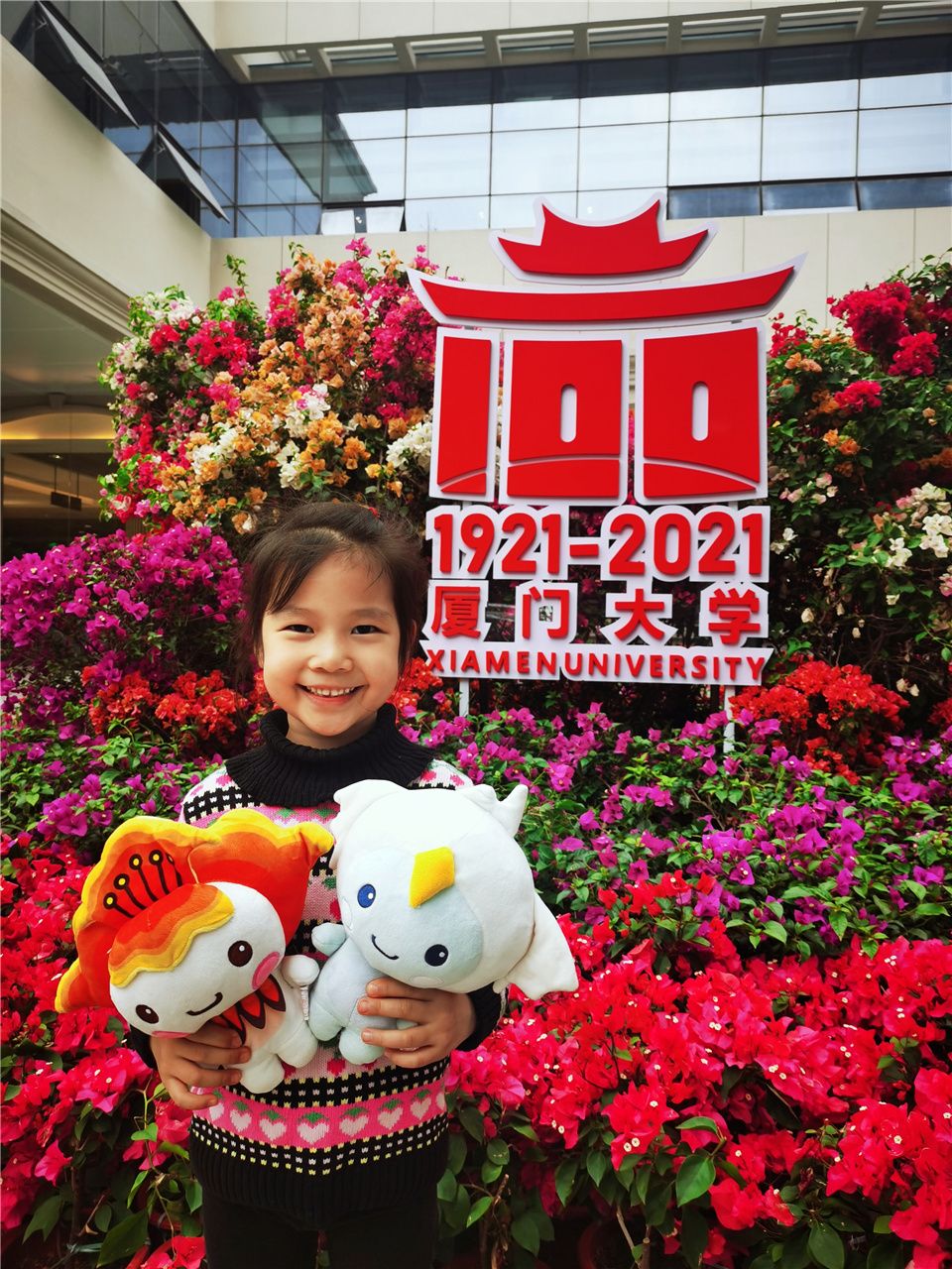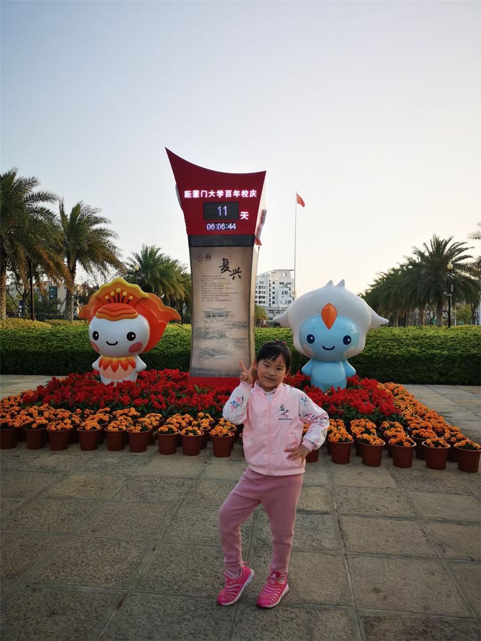 为了迎接百年校庆,校园内有很多主题建筑。从校庆倒计时牌前跑过,和站在花丛中微笑的吉祥物“小厦”、“小百”挥手,还和“百年”的木棉花一起拍照比心......