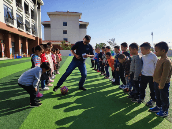 为此,孩子们提议一起去操场学习踢球。孩子们排成两队,边听讲解边看宽浡爸爸做示范,跃跃欲试。一次、两次、三次,还是没把球射进球门,继垚有些气馁。嘉乐和睿骞在一旁练习传球,可是对方总不能接到球。孩子们受挫,渐渐失去耐心。