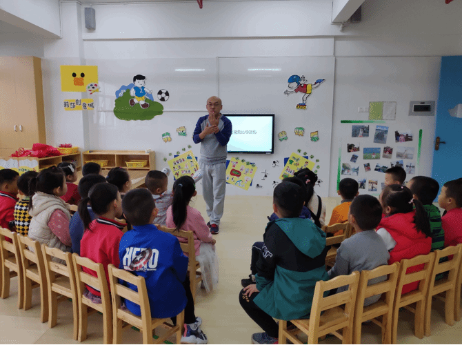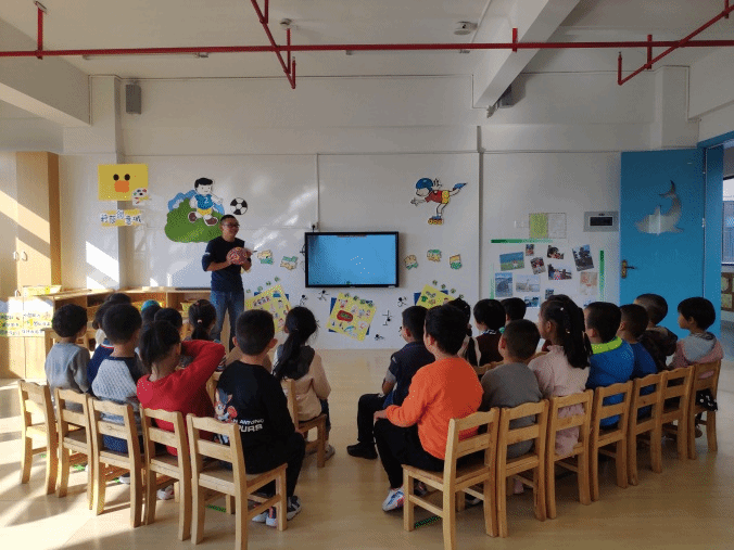 宽浡的提议得到了其他孩子们的支持,我们联系了宽浡爸爸,在征求了他的意见后,正式邀请他到幼儿园为孩子们讲解关于足球的知识。我们课前收集了小朋友们对足球的疑问,根据收集到孩子们的疑问与家长就课程的内容和开展形式进行了讨论,沟通了课程流程。宽浡爸爸来到班级,首先以PPT的形式系统地讲解了足球知识,以问答的形式解答孩子们的问题。孩子们通过宽浡爸爸的讲解,了解了足球的历史,现代足球队的组成形式以及常规的足球规则。