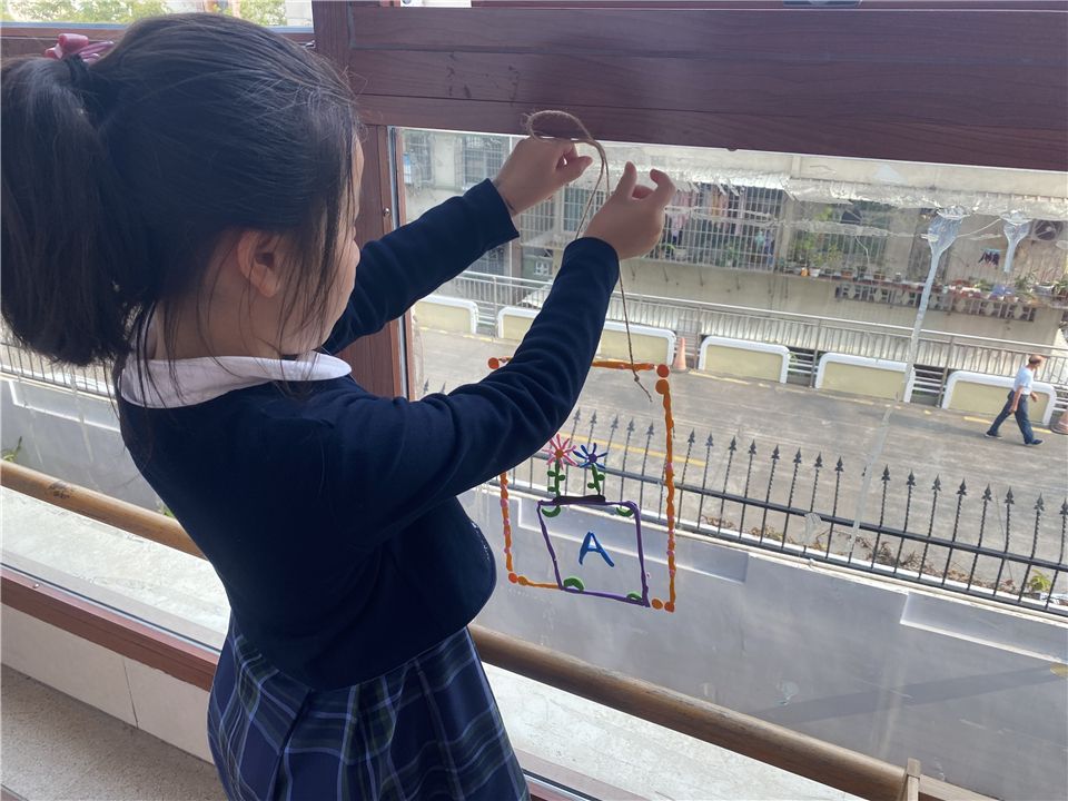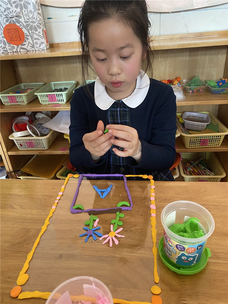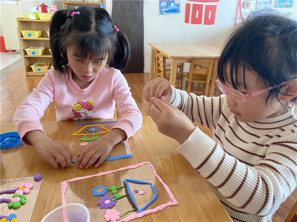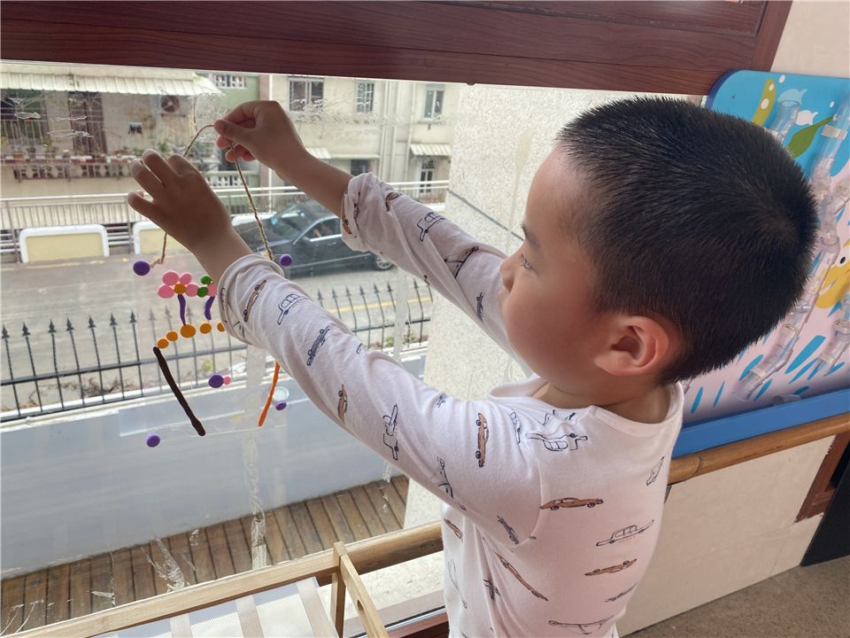 不仅如此,个别孩子还提出了想要装饰班级门口种植区的玻璃墙的想法。我们鼓励他们利用区域活动的时间制作,同时进行有针对性的指导。他们一个个认真地用手揉捏着超轻黏土,再将揉捏好的图案摁压在透明塑料板上,最后在老师的帮助下用麻绳吊住这些五颜六色的挂饰,以此留住春天的小美好!