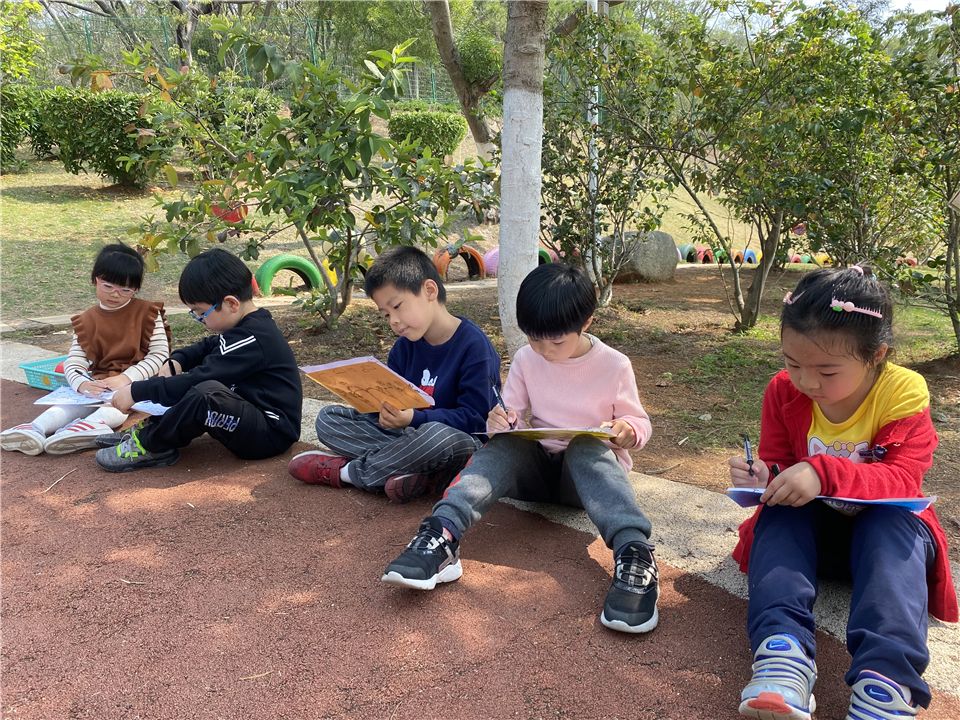 暖暖的春风吹来,包裹着我们。孩子们在老师的带领下来到小山坡上,找一处美景,拿起画笔将这美丽的春色留住。
