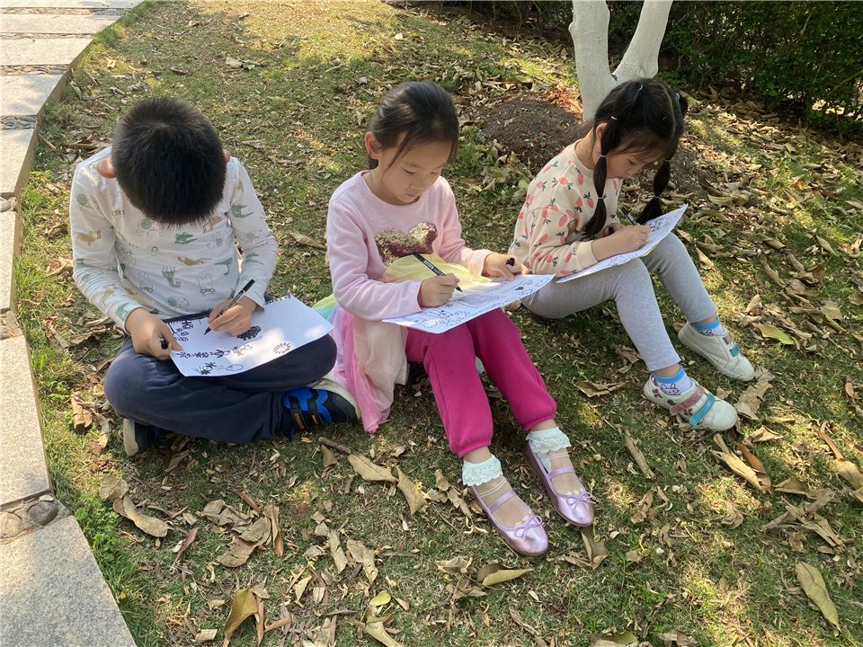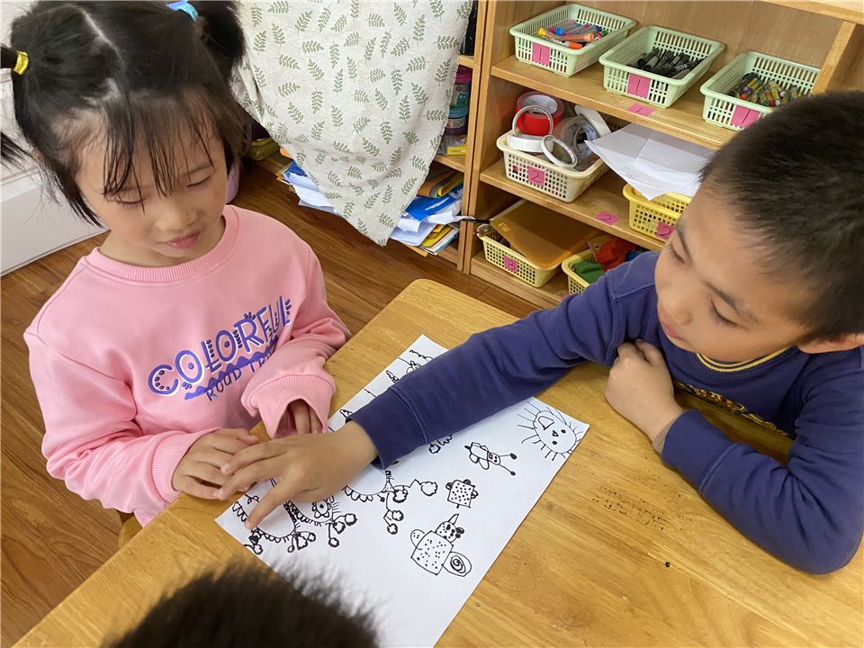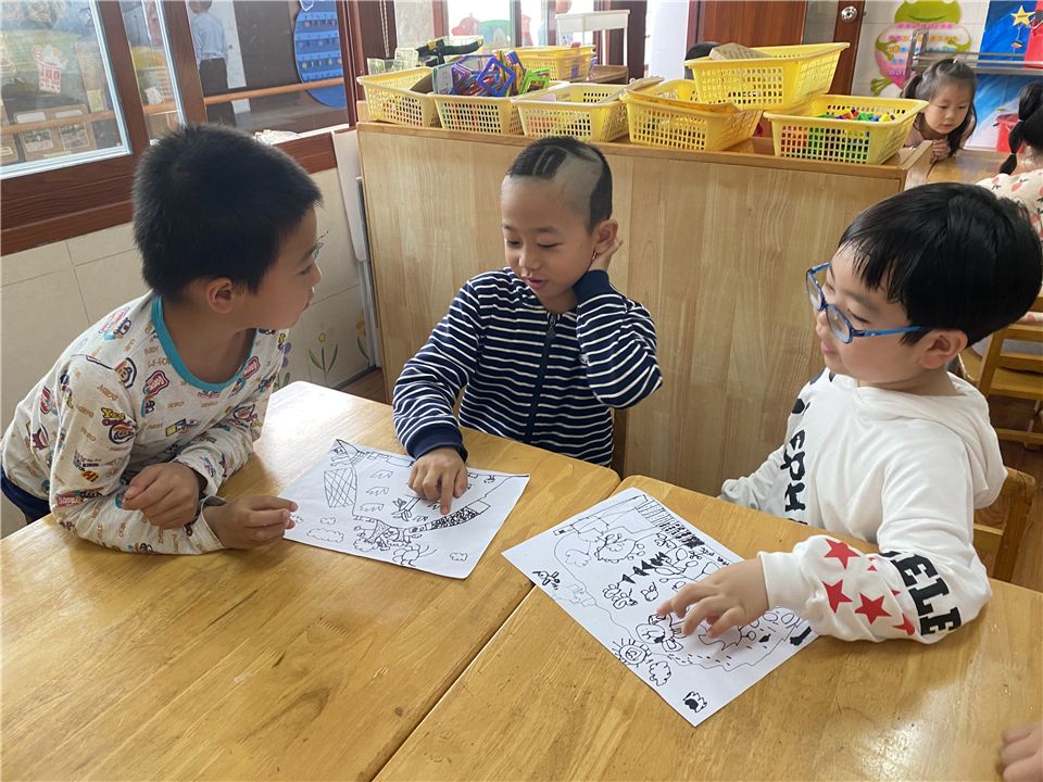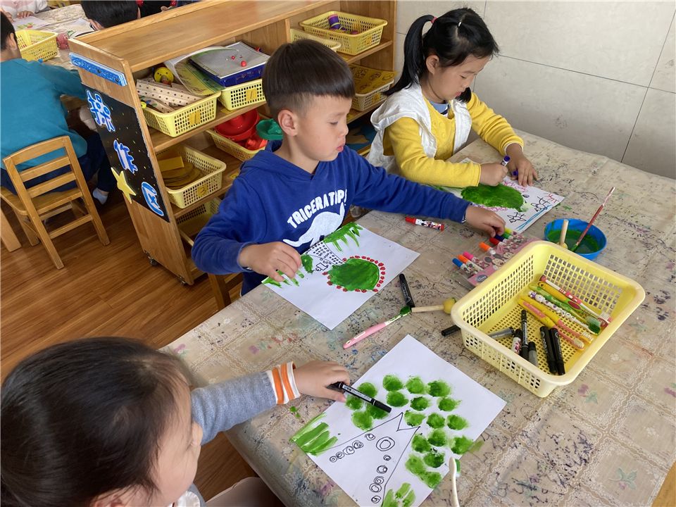 “你看!这是我画的小山坡上的树,他们就像一个个小士兵一样。”兜兜自豪地告诉身边的小伙伴们。