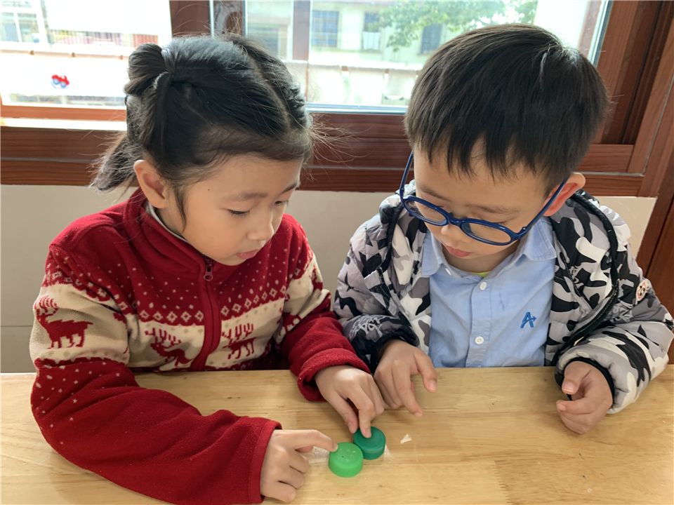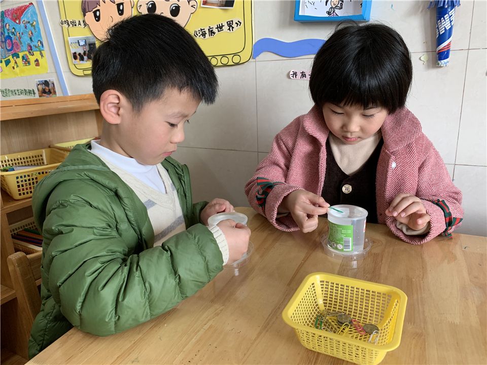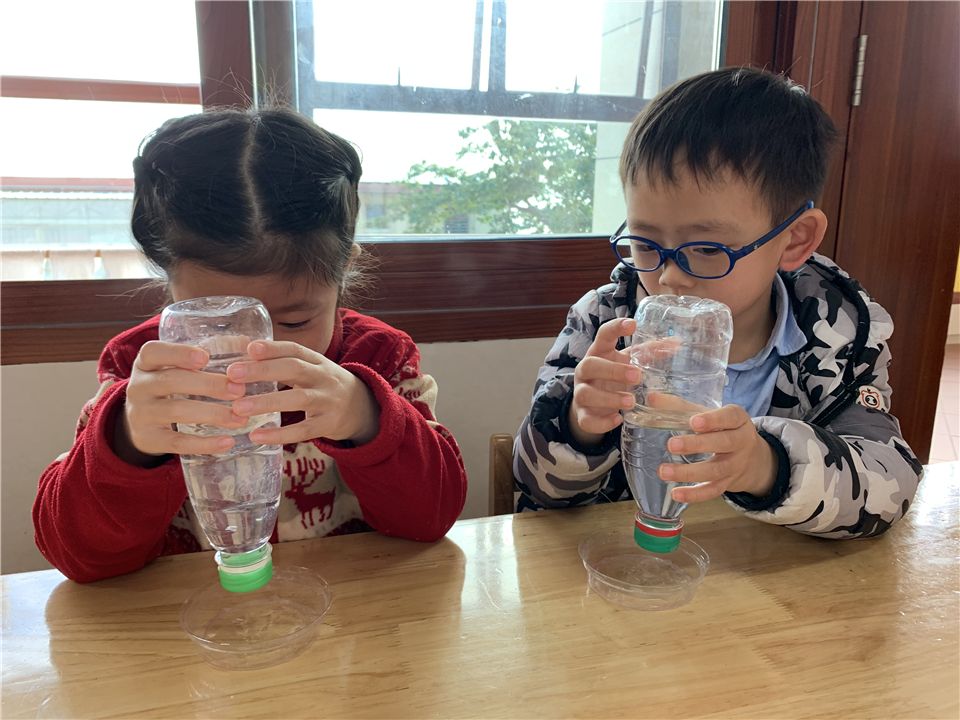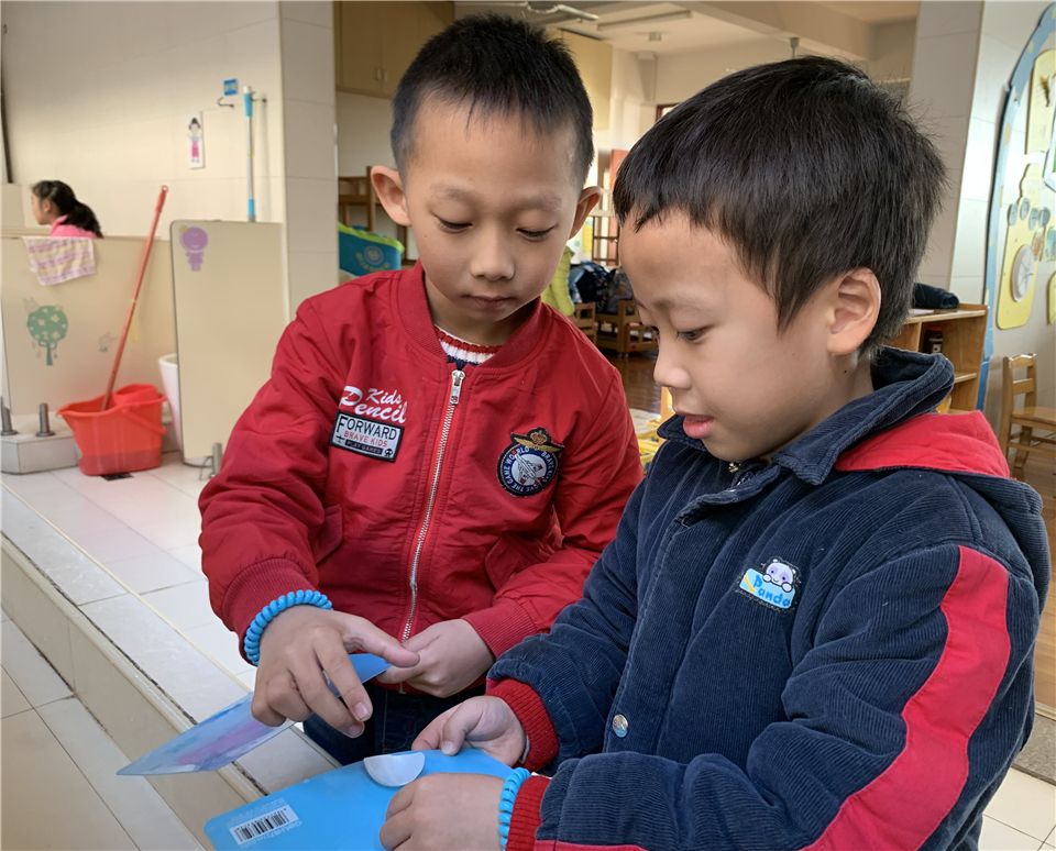 原来,大六班的宝贝们利用水的黏附力玩起了迷迷转的游戏。