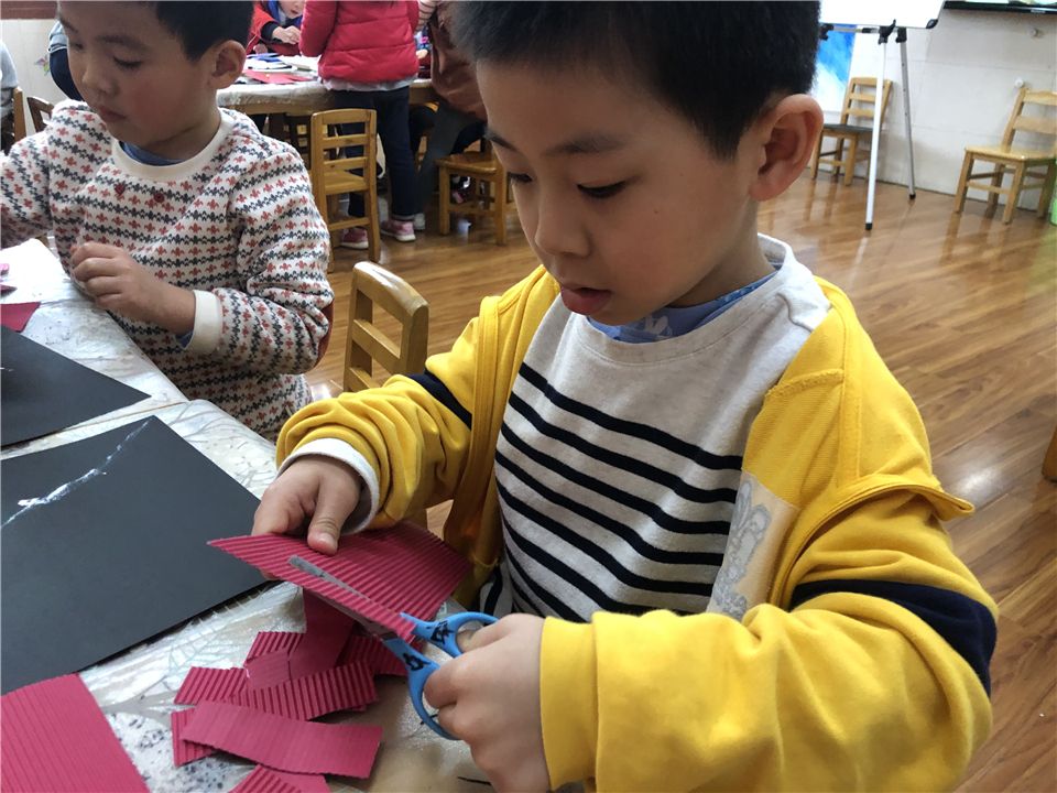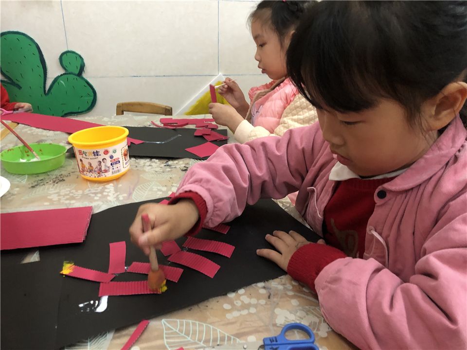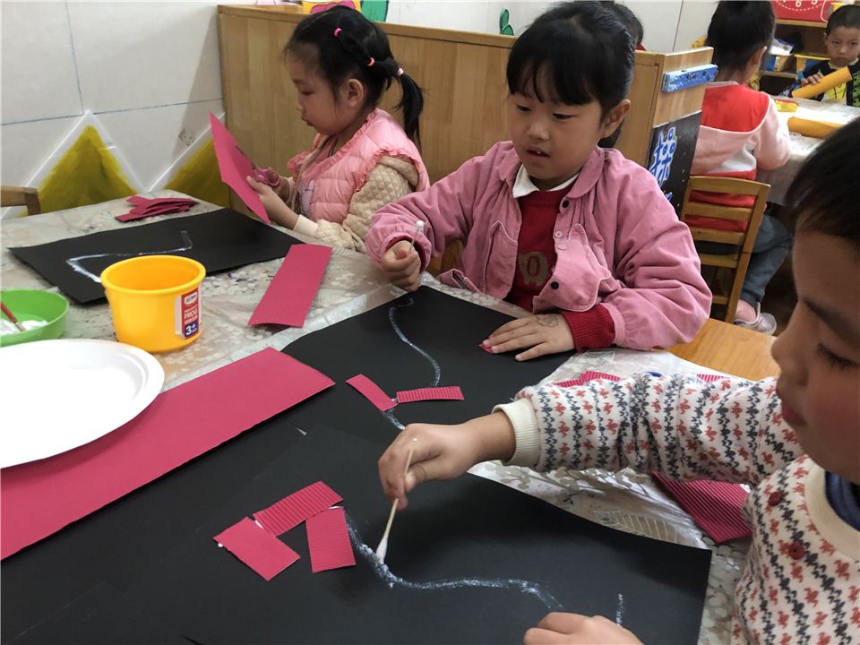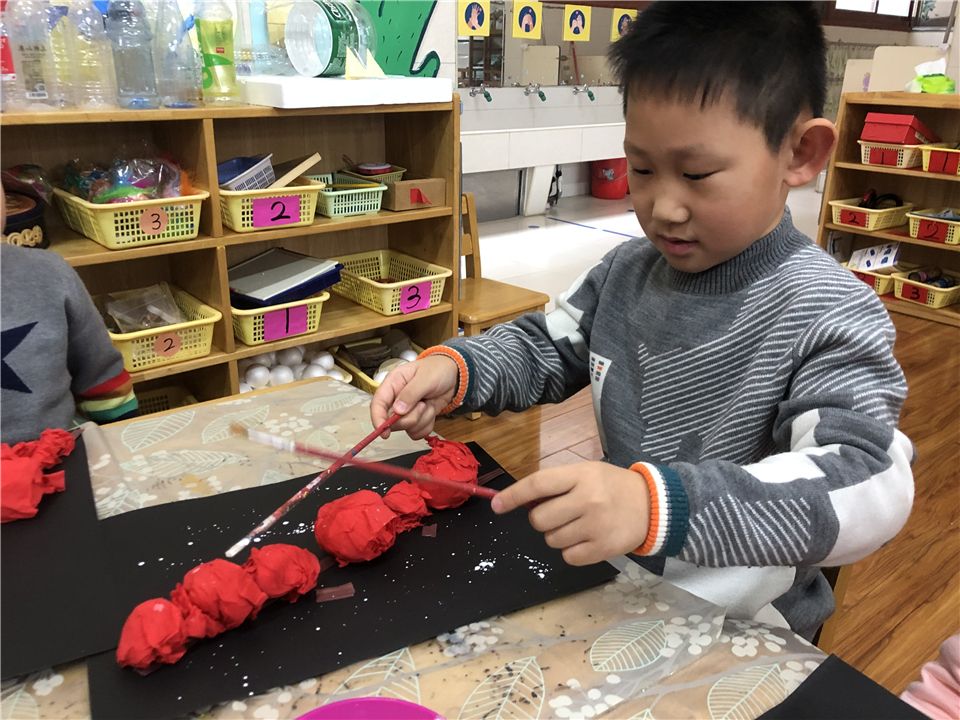 说干就干,萌娃们将卡纸剪一剪、黏一黏,再串一串,瞧,红红火火的鞭炮就完成啦!