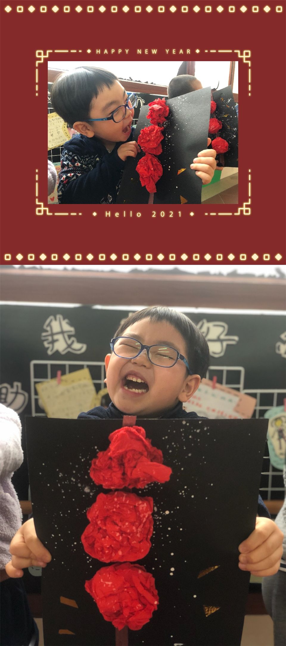 在这新年来临之际,萌娃们用自己的方式欢欢喜喜过大年,祝愿大三班的萌娃们在新的一年开开心心,身体壮壮!年年岁岁,健康快乐的成长!