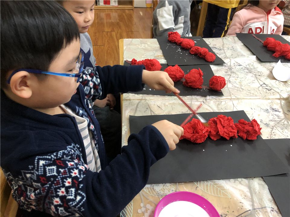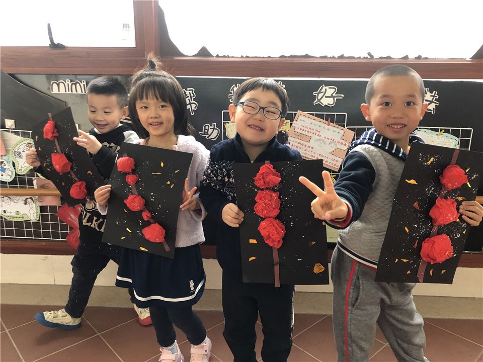 萌娃们用白色的颜料当做糖,将“糖”撒在了山楂串上,这下,美味的冰糖葫芦就完成啦,快带回家和粑粑麻麻们分享吧!