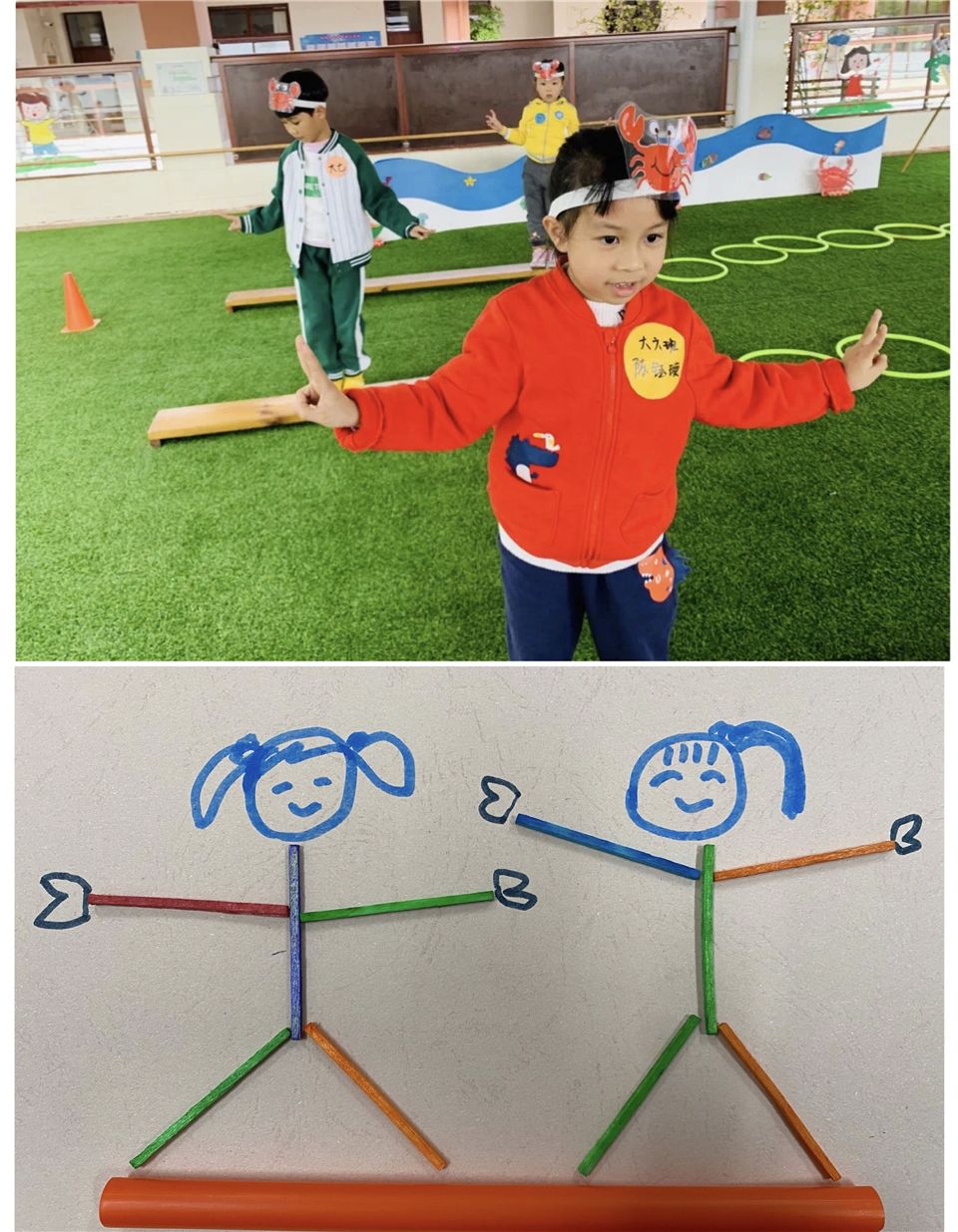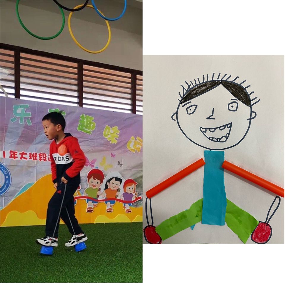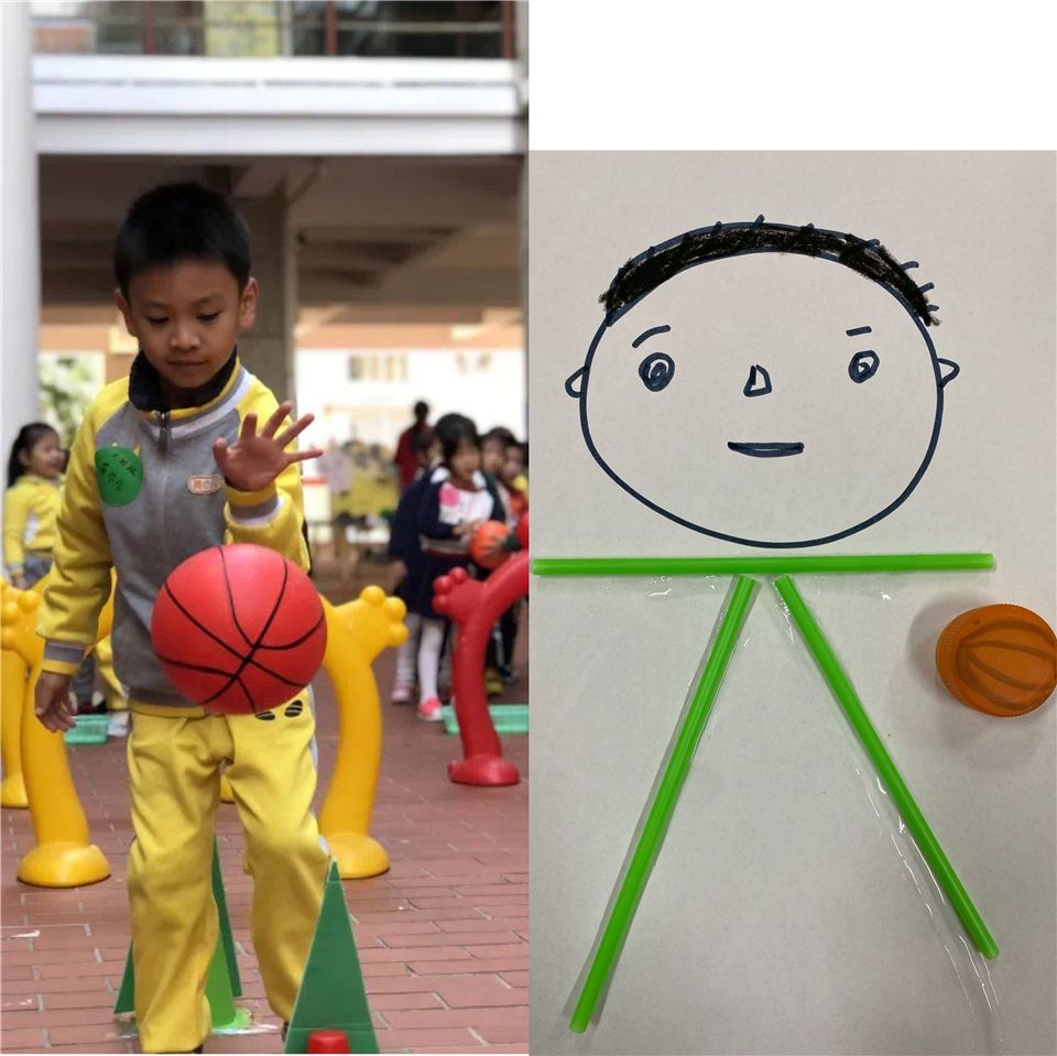 大班段趣味运动会后,孩子们意犹未尽,点心后,孩子们三三两两聚在一起,围绕运动会的趣事讨论着。麦麦说:“卓一,你那天比赛拍球的动作太酷了。”“朵朵比赛时的表情太搞笑了”依依说,其他的孩子们都来了兴致,他们你一言我一语的讨论起运动会上自己看到有趣的动作和表情。朵朵说:“如果我们把运动会看到的表情和动作创作出来,应该也会很有趣”......围绕运动会趣事的美术创意活动就这样开始了!